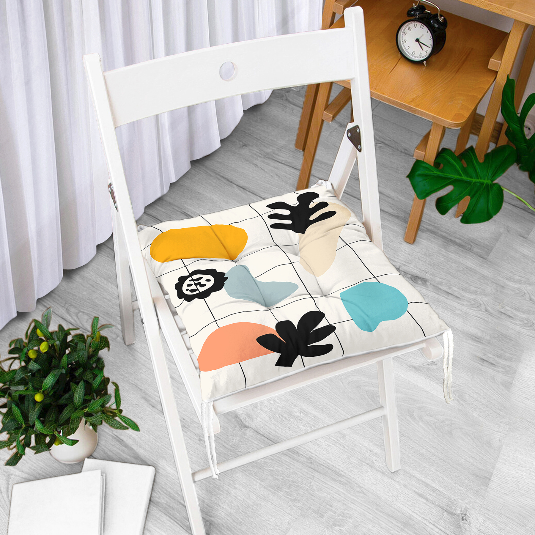 Renkli Zemin Üzerinde Onedraw Çizimli Yaprak Motifli Dijital Baskılı Modern Pofuduk Sandalye Minderi Realhomes