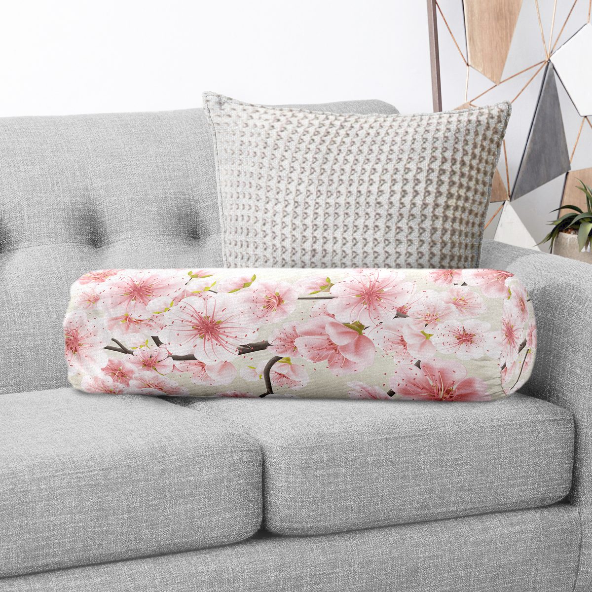 Renkli Zemin Üzerinde Pembe Çiçek Desenli Dijital Baskılı Modern İç Dolgulu – Fermuarlı Süet Silindir Daire Yastık Kırlent