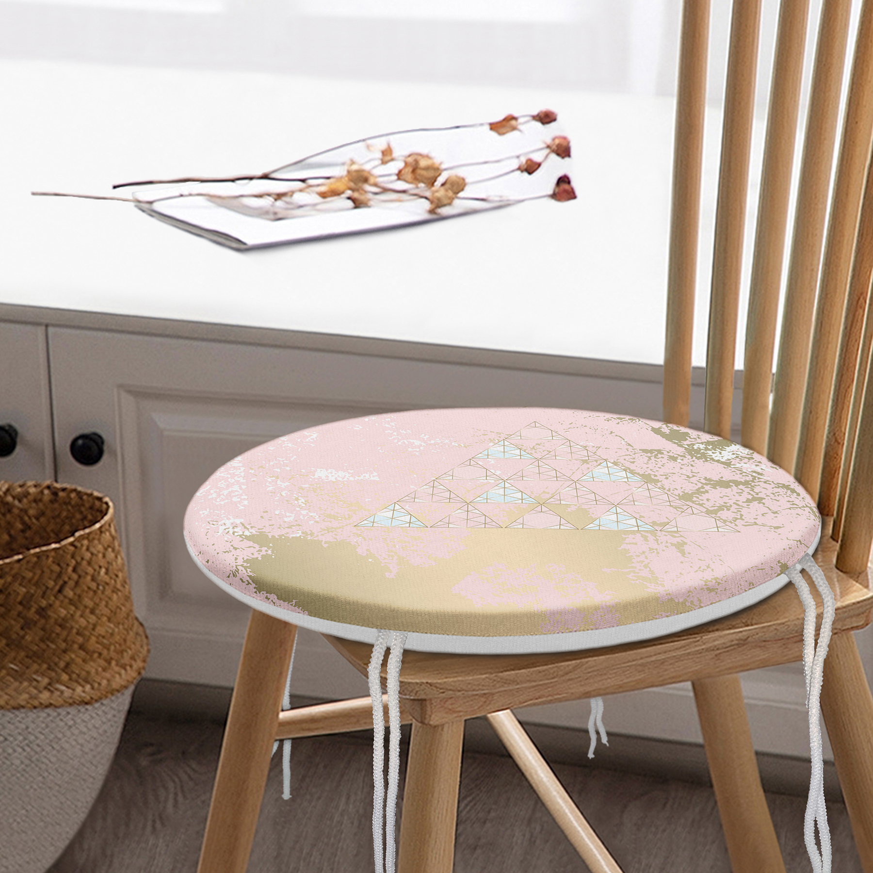 Renkli Zemin Üzerinde Üçgen Desenli Dijital Baskılı Modern Yuvarlak Fermuarlı Sandalye Minderi