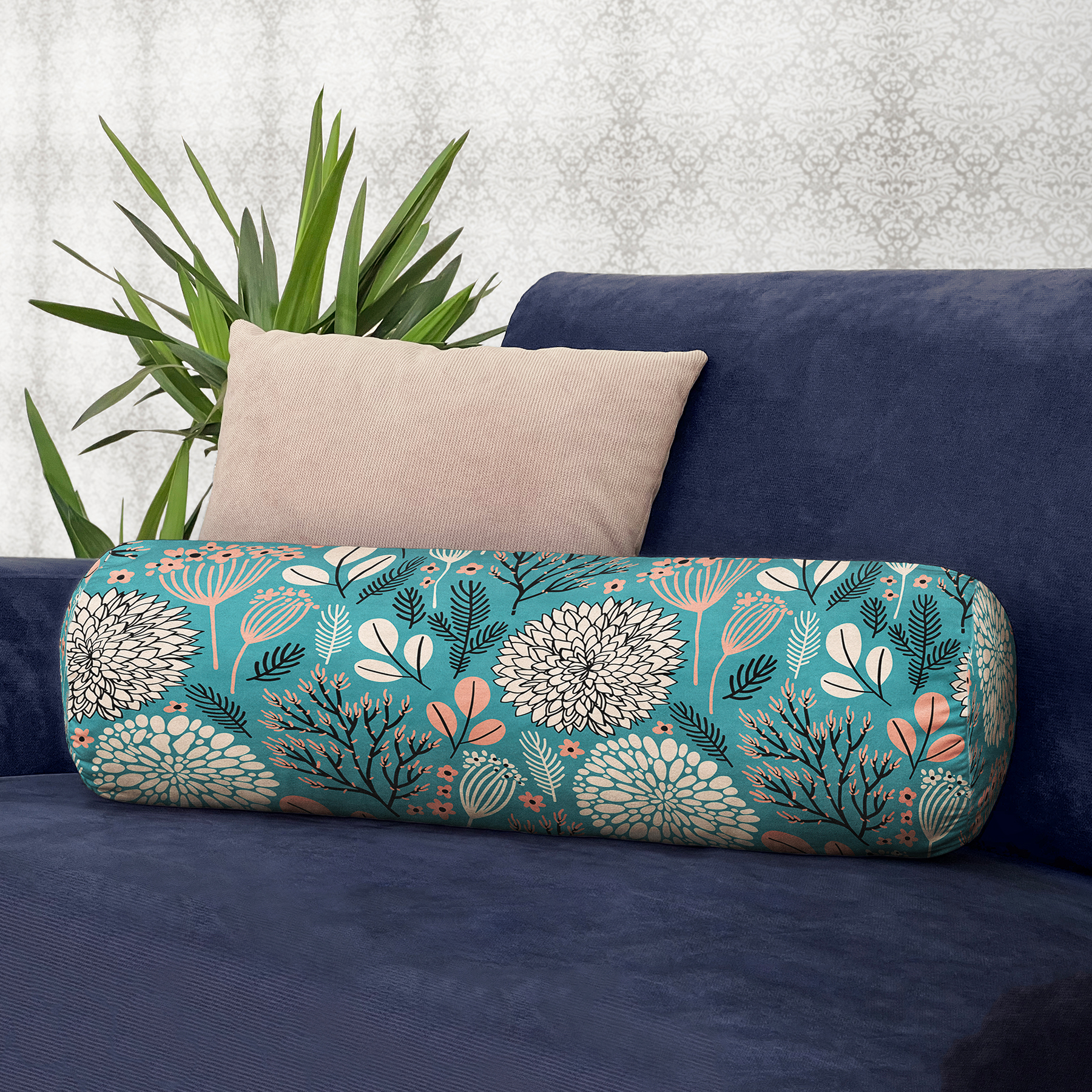 Renkli Zemin Üzerinde Yaprak Desenli Dijital Baskılı Modern İç Dolgulu – Fermuarlı Süet Silindir Yuvarlak Yastık Kırlent