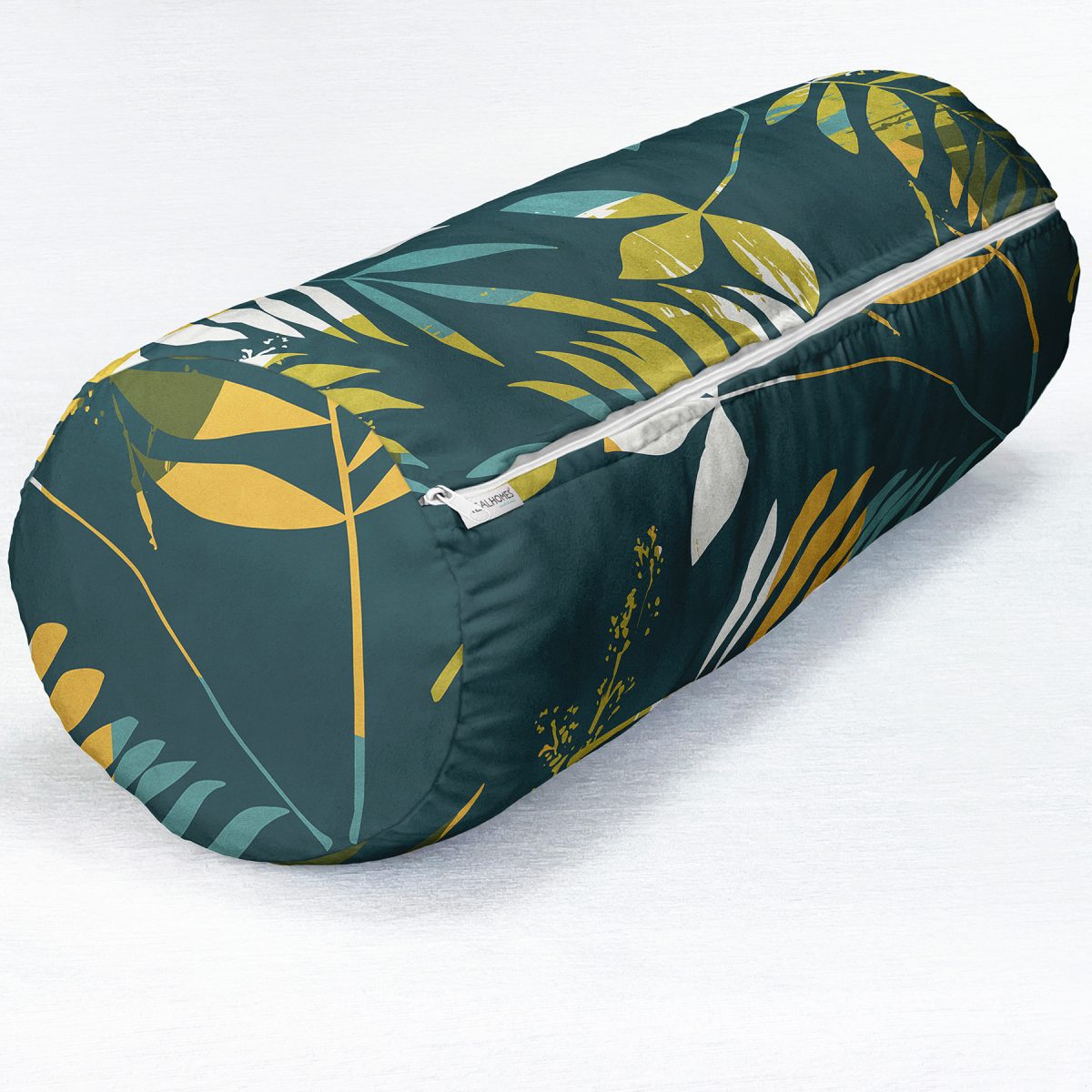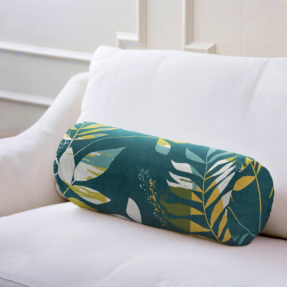 Renkli Zemin Üzerinde Yaprak Motifli Dijital Baskılı Modern İç Dolgulu – Fermuarlı Süet Silindir Daire Yastık Kırlent