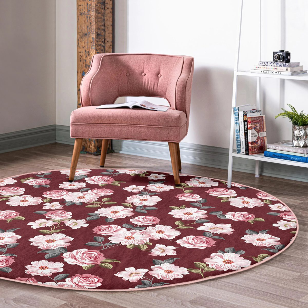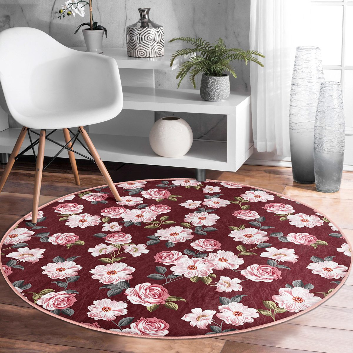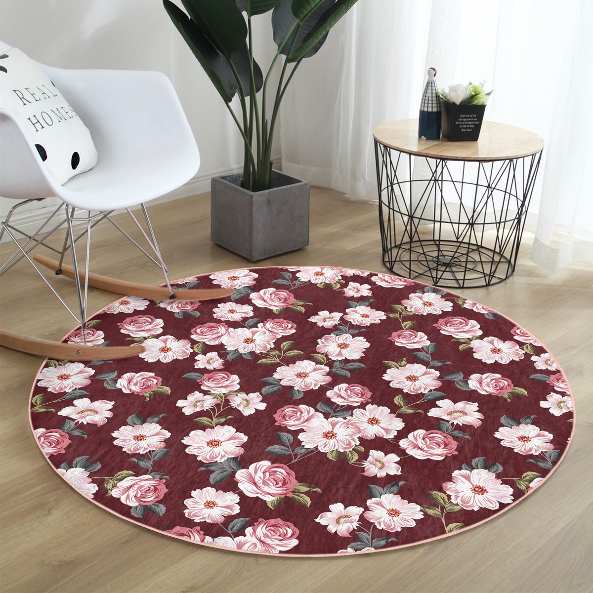 Renkli Zeminde Çiçek Desenli Dijital Baskılı Modern Bordo Yatak Odası Yıkanabilir Kaymaz Tabanlı Yuvarlak Halı