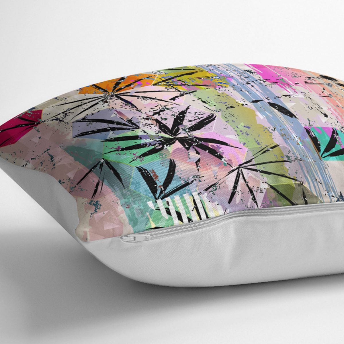 Renkli Zeminde Geometrik Yaprak Desenli Kırlent Kılıfı