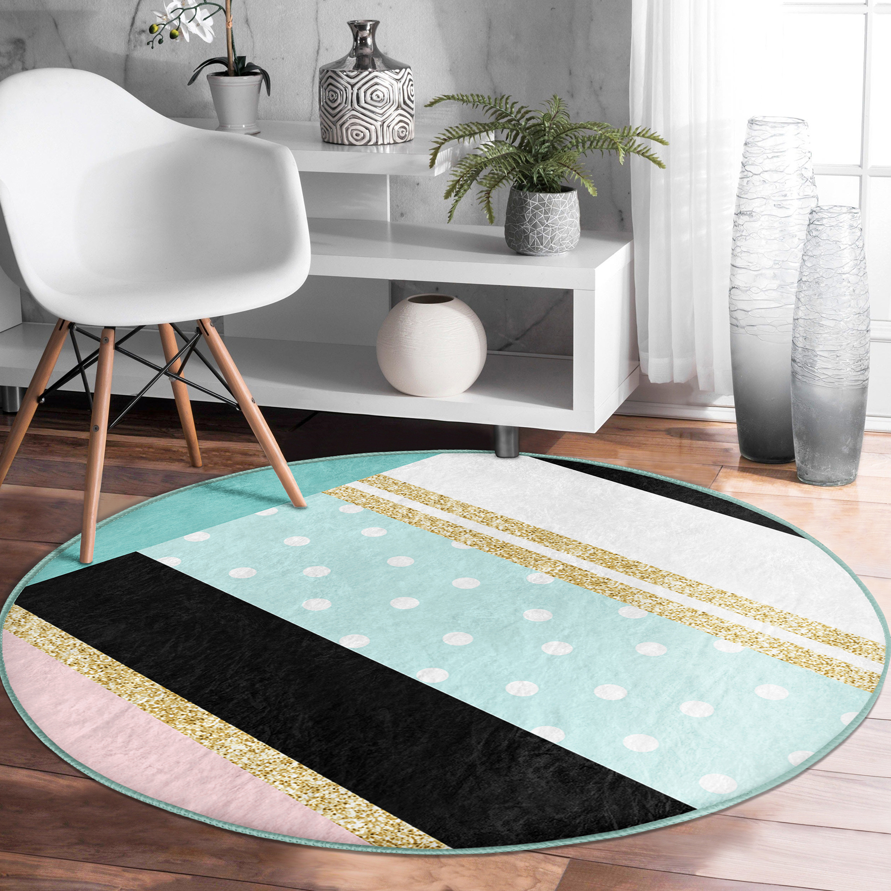 Renkli Zeminde Gold Detaylı Geometrik Çizimli Dijital Baskılı Modern Turkuaz Banyo Yıkanabilir Kaymaz Tabanlı Yuvarlak Halı