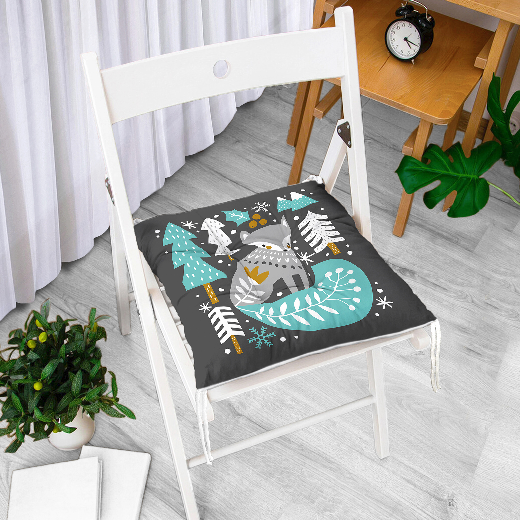 Renkli Zeminde Onedraw Çizimli Yılbaşı Temalı Dijital Baskılı Modern Pofuduk Sandalye Minderi Realhomes