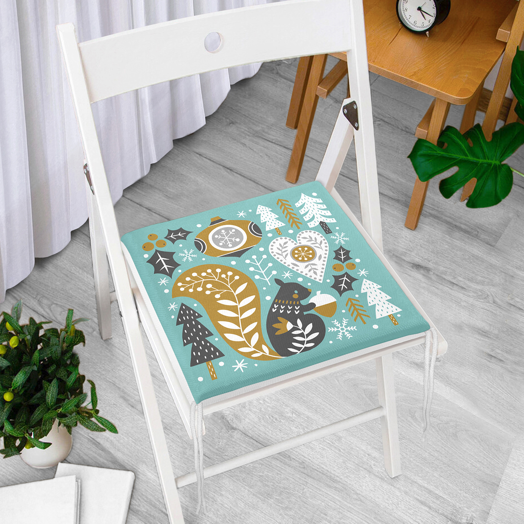 Renkli Zeminde Sincap Desenli Dijital Baskılı Modern Fermuarlı Sandalye Minderi
