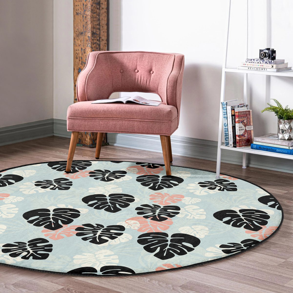 Renkli Zeminde Siyah Yaprak Desenli Dijital Baskılı Modern Koridor ve Antre Yıkanabilir Kaymaz Tabanlı Yuvarlak Halı