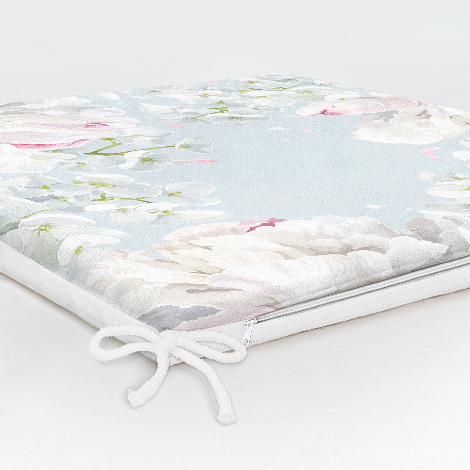 Renkli Zeminli Beyaz Çiçek Desenli Dijital Baskılı Modern Fermuarlı Sandalye Minderi