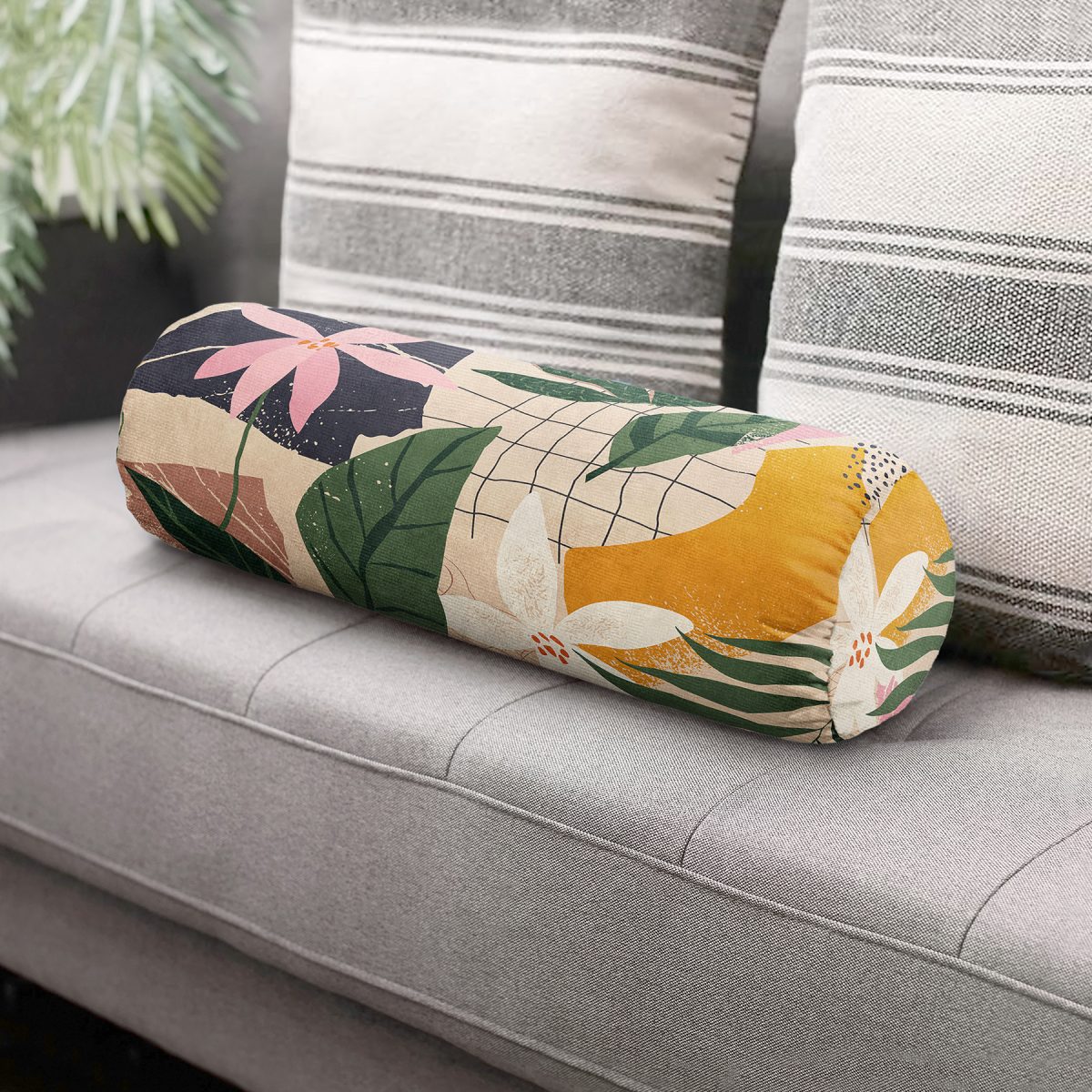 Renkli Zeminli Yaprak Desenli Onedraw Çizim Dijital Baskılı Modern İç Dolgulu Süet Silindir Yastık Kırlent – Bel Yastığı