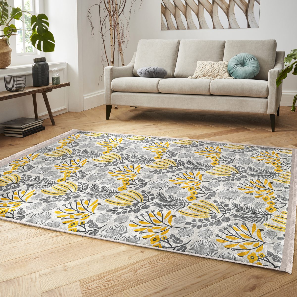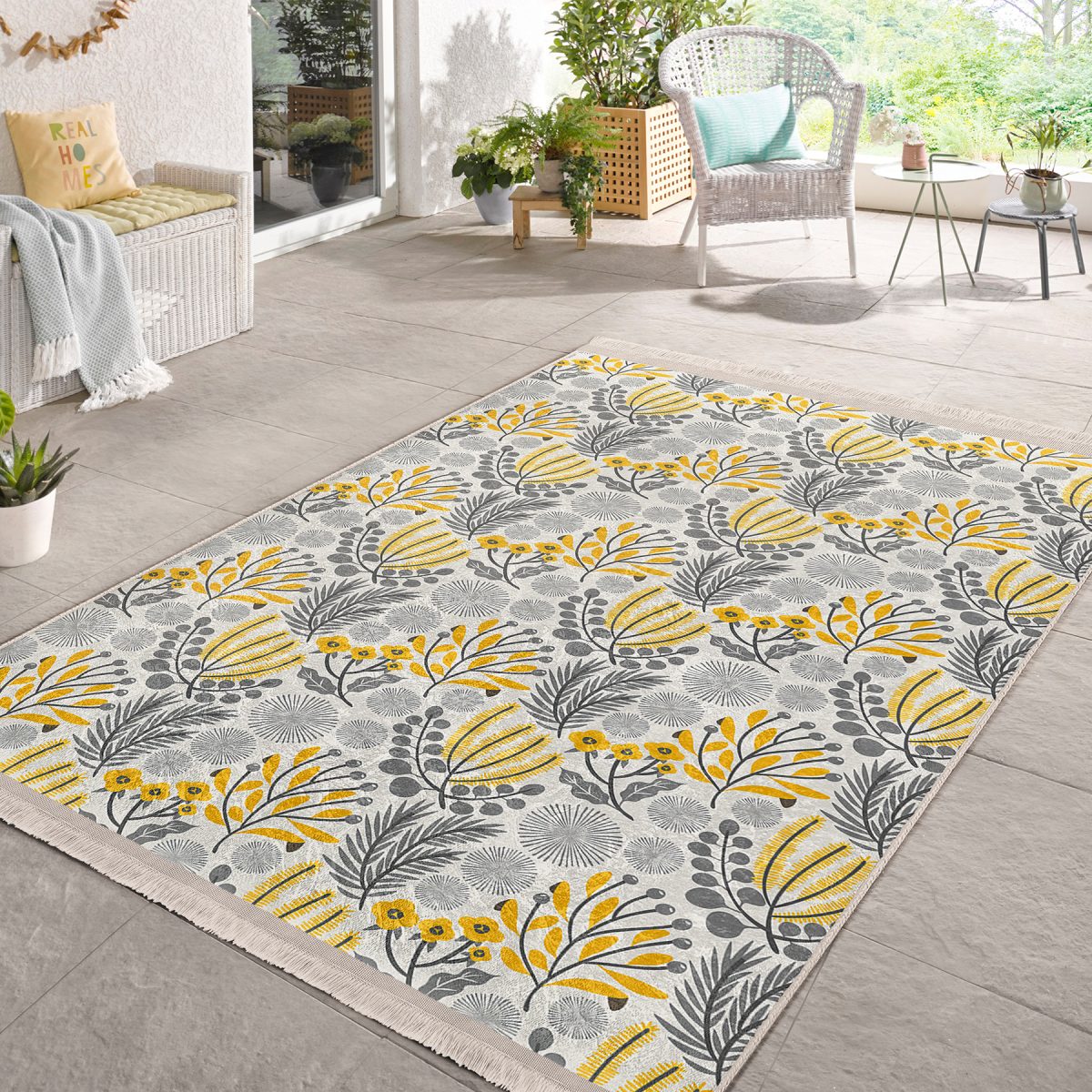 Sarı – Gri Zeminde Çiçek ve Yaprak Motifli Floral Desenli Floral Klasik Koridor & Antre Dış Mekan & Outdoor Dijital Baskılı Makinede Yıkanabilir Kaymaz Taban Saçaklı Halı