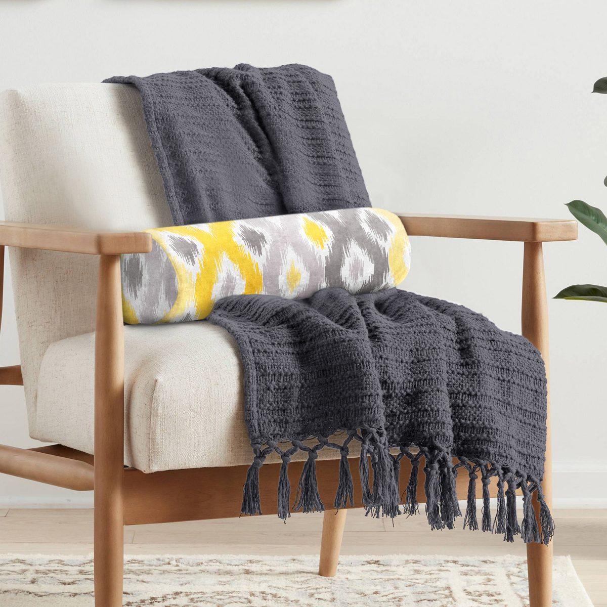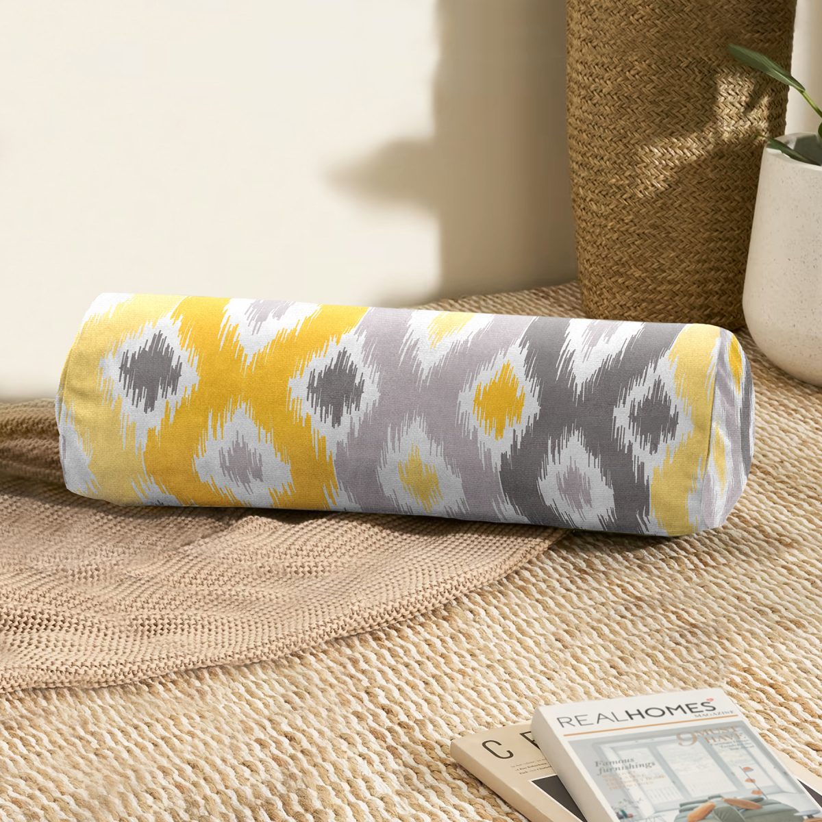 Sarı Gri Zikzak Desenli Modern Tasarımlı Dekoratif İç Dolgulu – Fermuarlı Süet Silindir Yuvarlak Yastık Kırlent