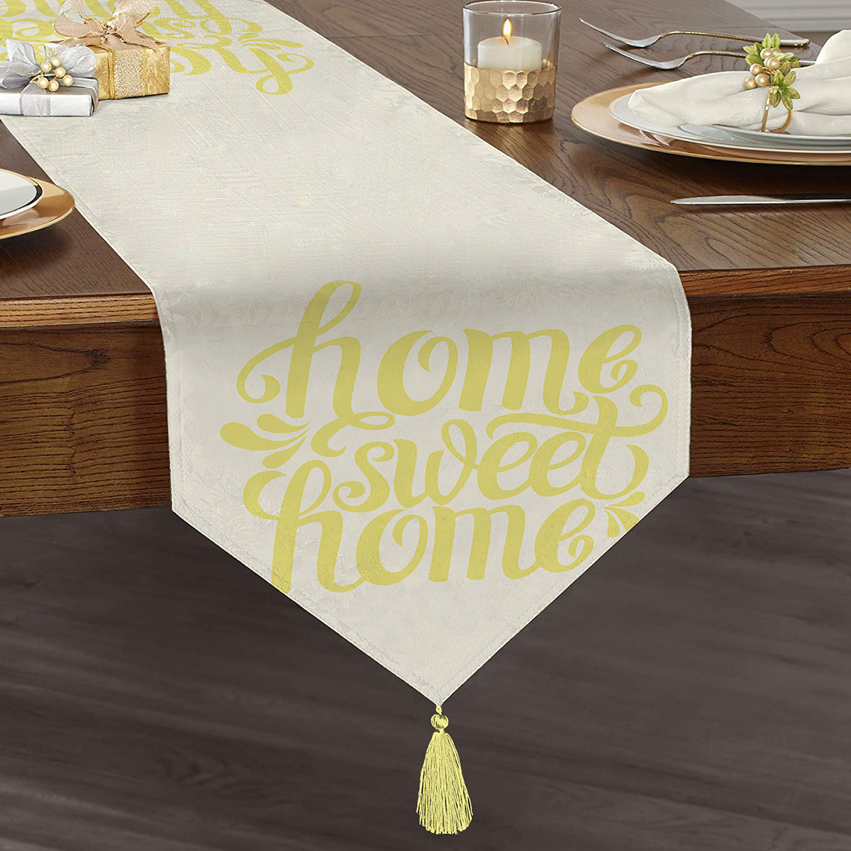 Sarı Home Sweet Home Dekoratif Püsküllü Şönil Üçgen Runner Realhomes