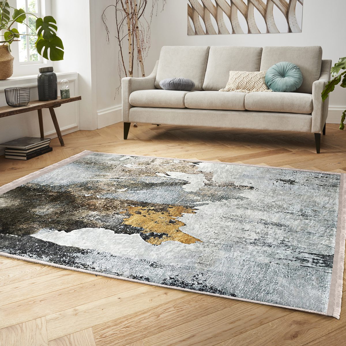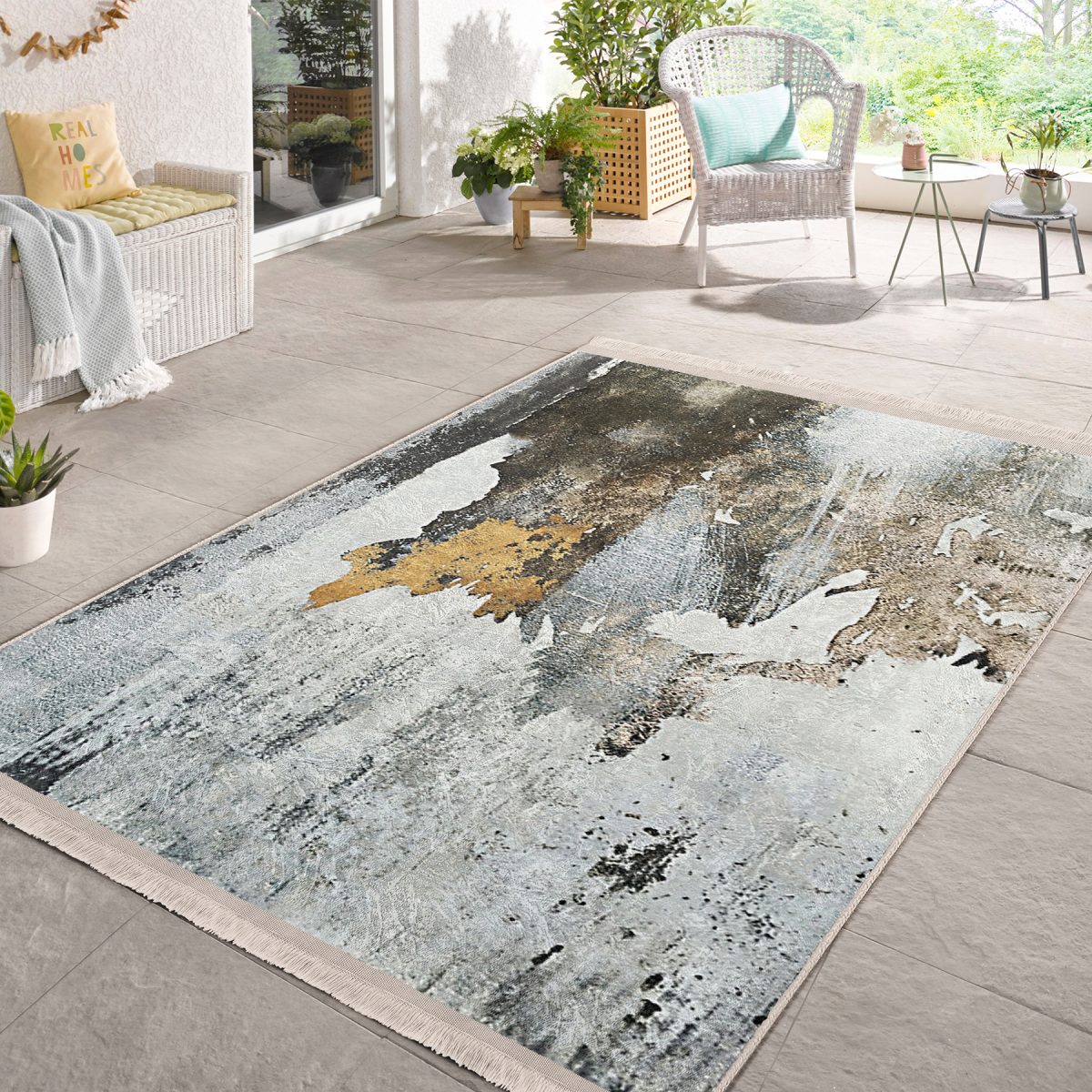 Füme Zeminde Sanat Motifli Lacivert Boya Desenli Eskitme Motifli Modern Koridor & Antre Salon & Oturma Odası Dijital Baskılı Makinede Yıkanabilir Kaymaz Taban Saçaklı Halı