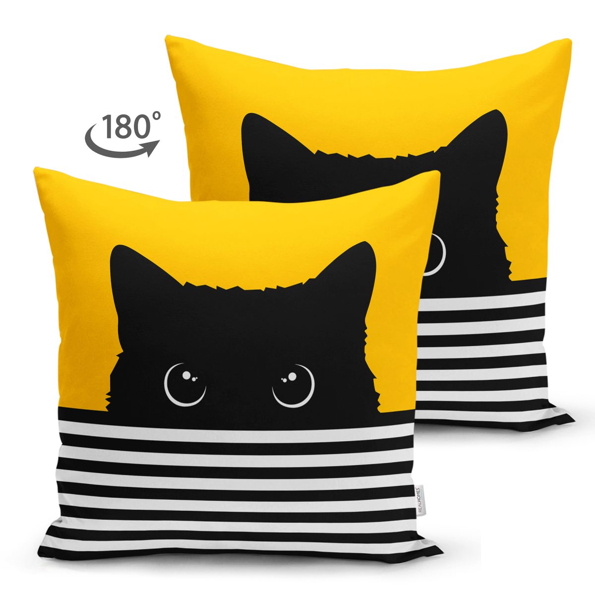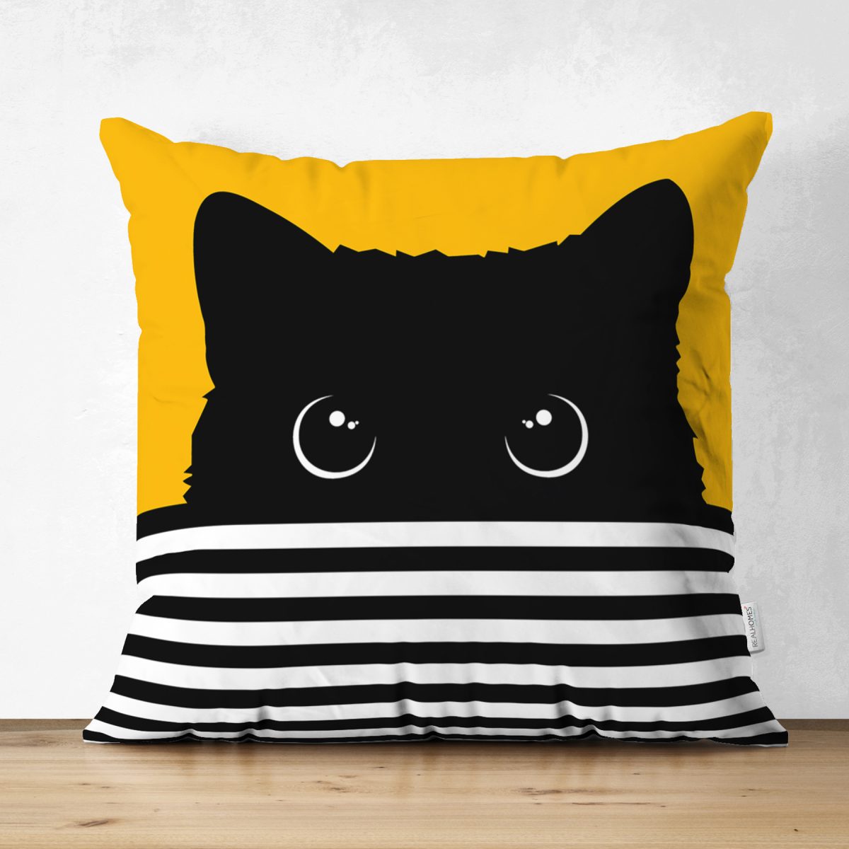 Sarı Zemin Çizgili Motif Kara Kedi Tasarımlı Modern Süet Yastık Kırlent Kılıfı Realhomes