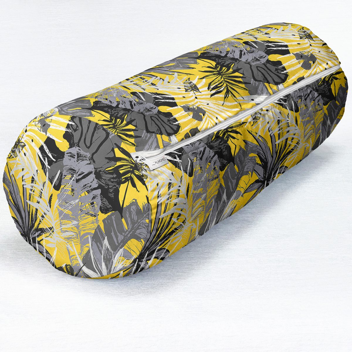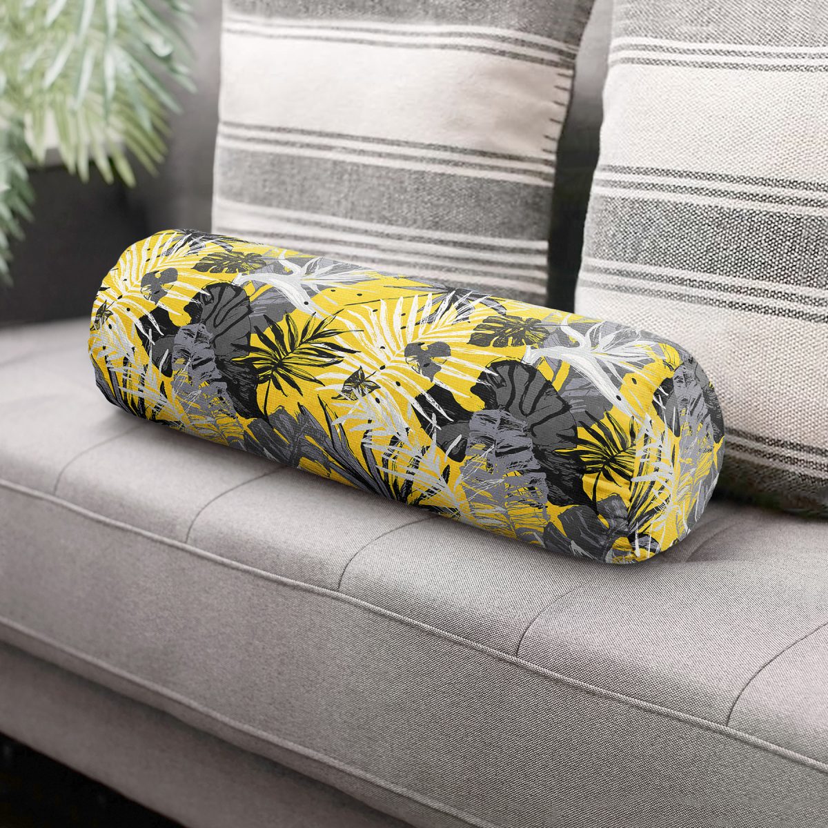 Sarı Zemin Üzerinde Beyaz Ve Gri Yaprak Motifli İç Dolgulu – Fermuarlı Süet Silindir Yuvarlak Yastık Kırlent