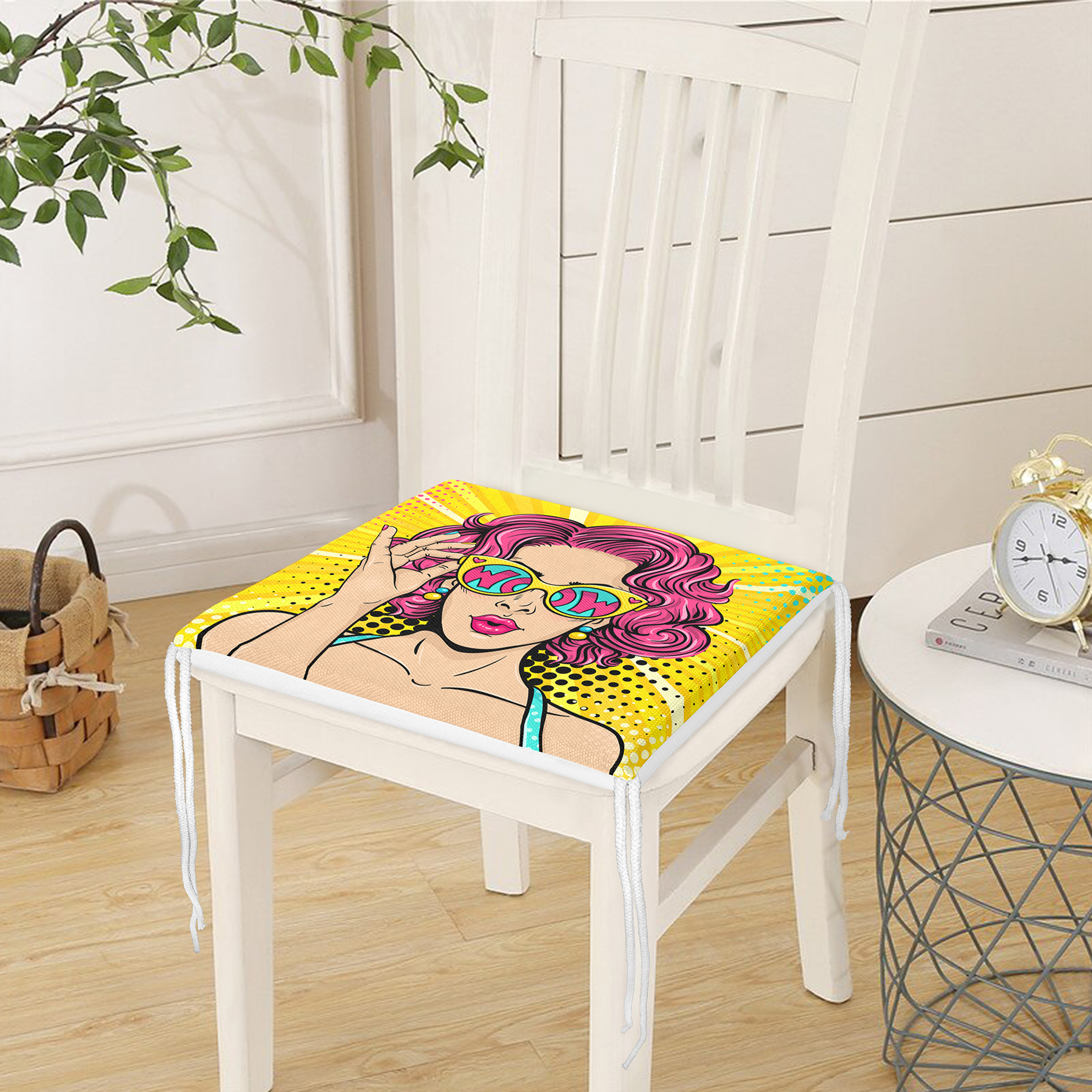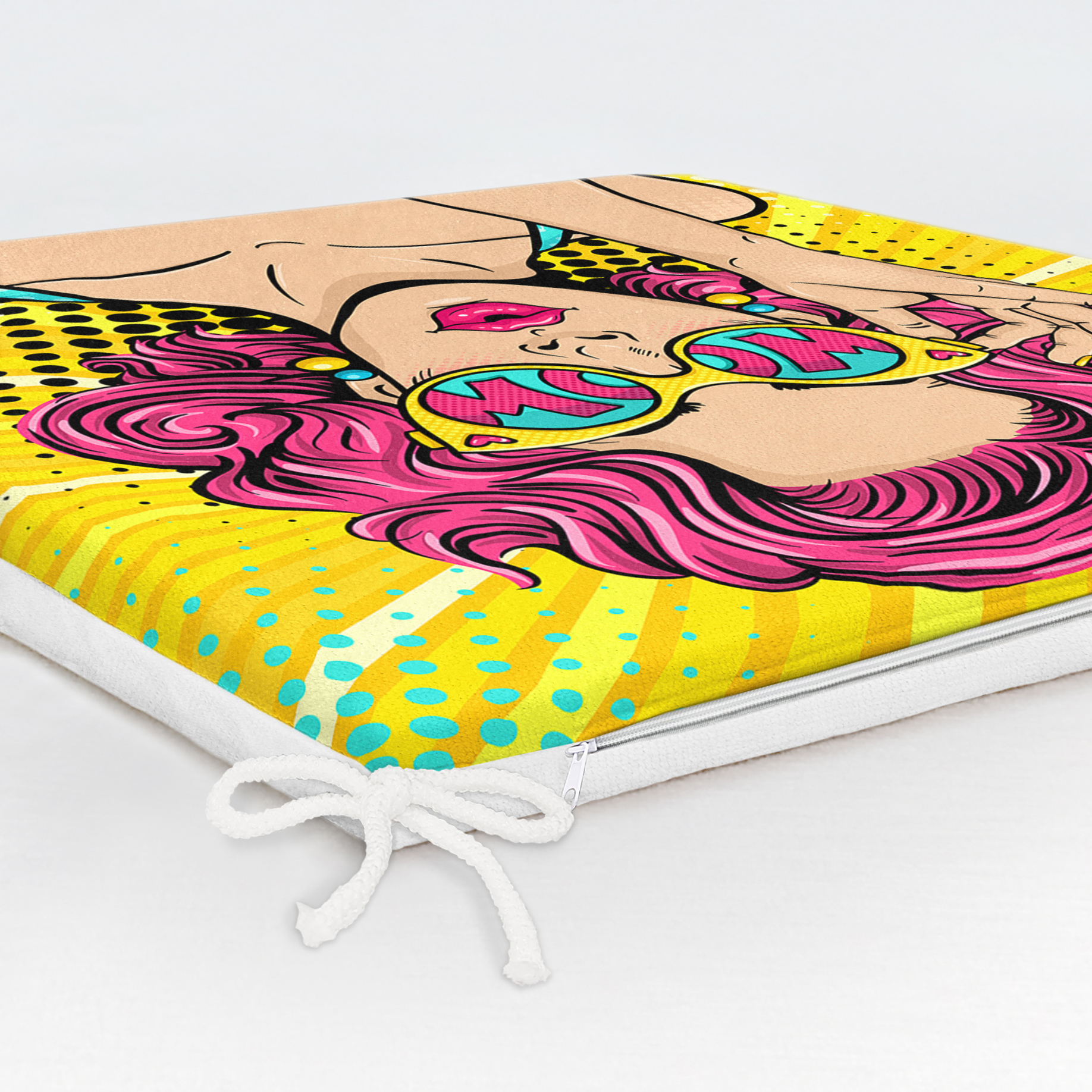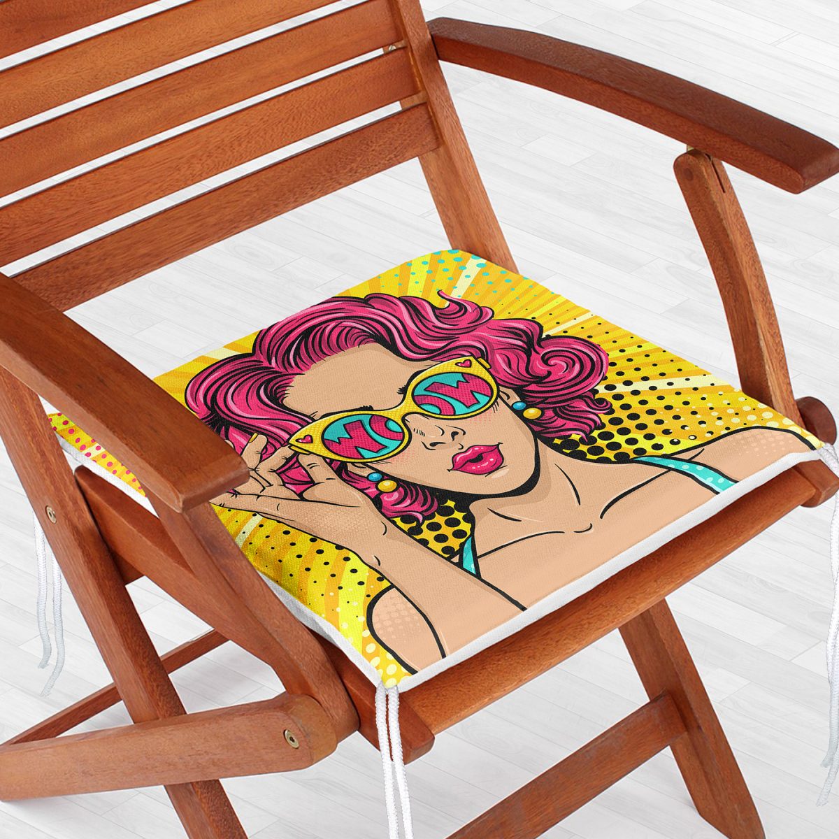 Sarı Zeminli Pop Art Girl Desenli Dekoratif Fermuarlı Sandalye Minderi