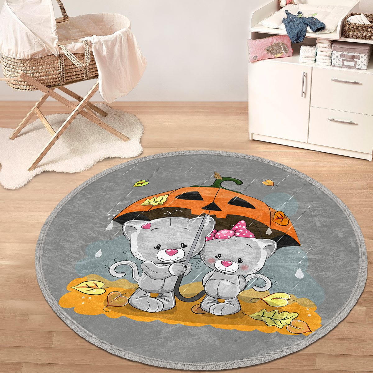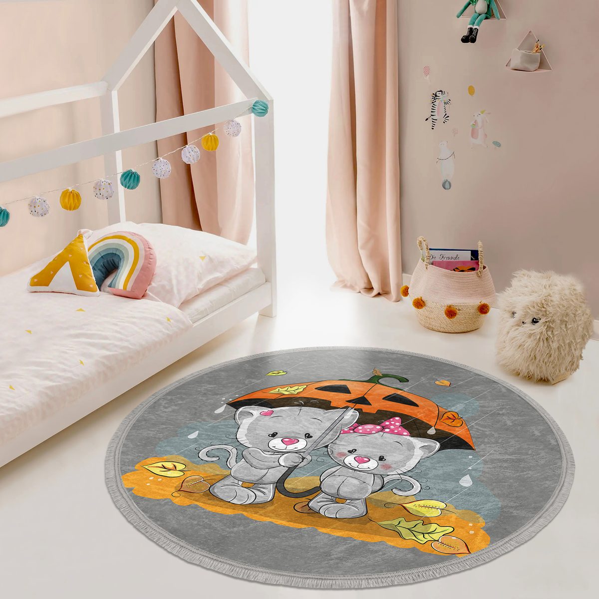 Şemsiye Tutan Sevimli Kedi Figürlü Çocuk & Genç Odası Makinede Yıkanabilir Kaymaz Tabanlı Püsküllü Yuvarlak Çocuk Halısı