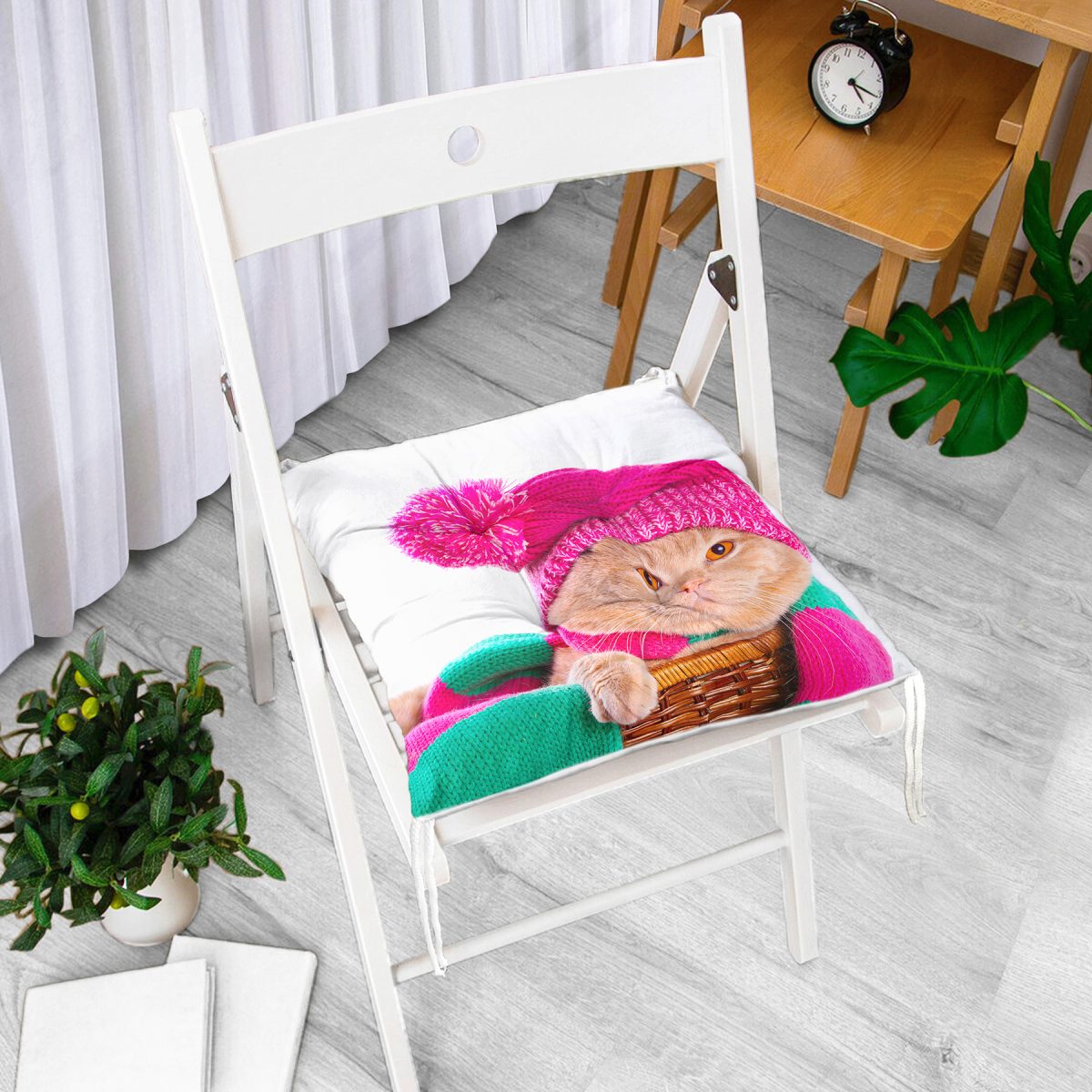 Sepet İçinde Pembe Şapkalı Sevimli Kedicik Dekoratif Pofuduk Sandalye Minderi Realhomes