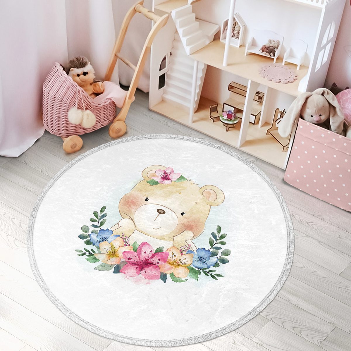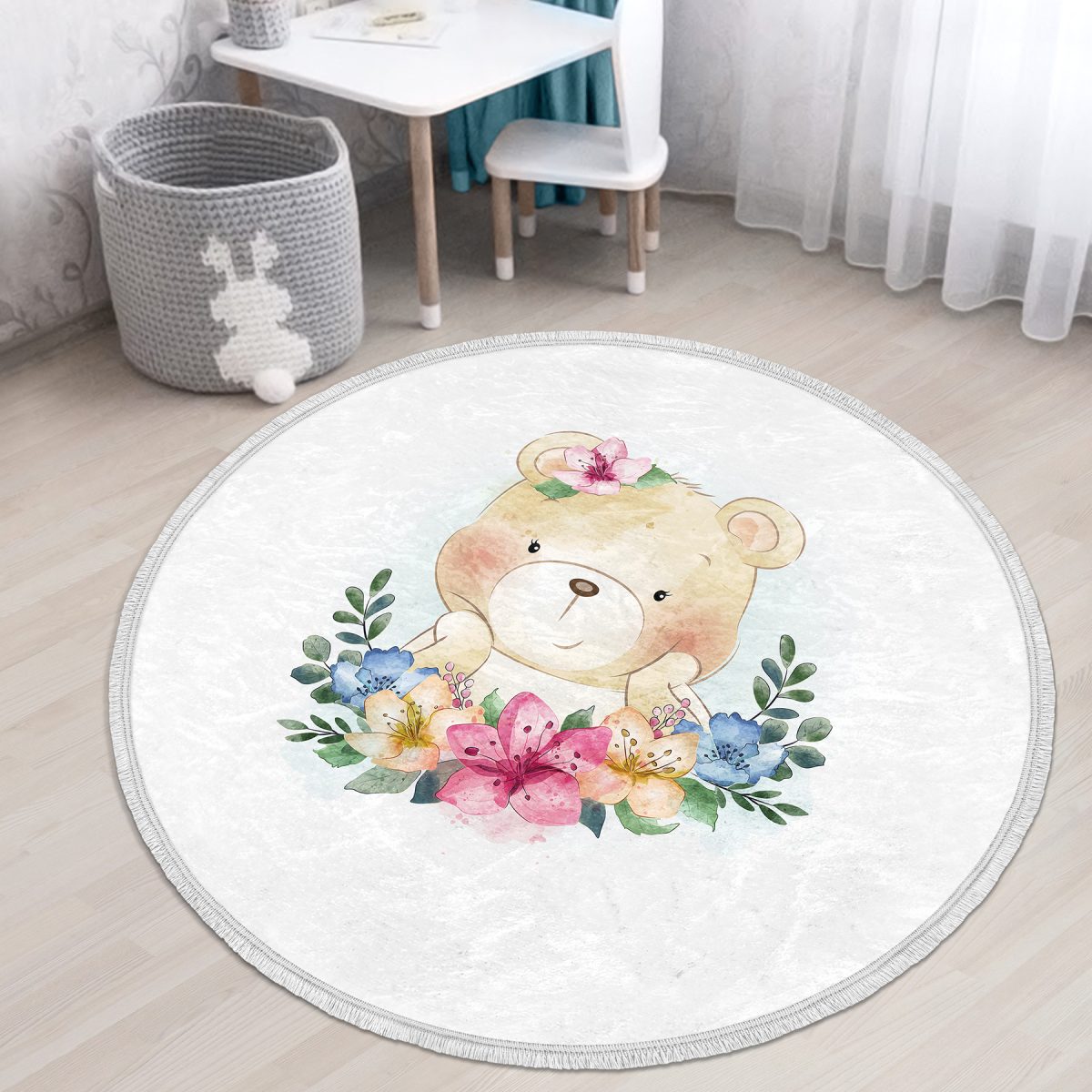 Sevimli Bebek Ayıcık Çocuk & Genç Odası Makinede Yıkanabilir Kaymaz Tabanlı Püsküllü Yuvarlak Çocuk Halısı
