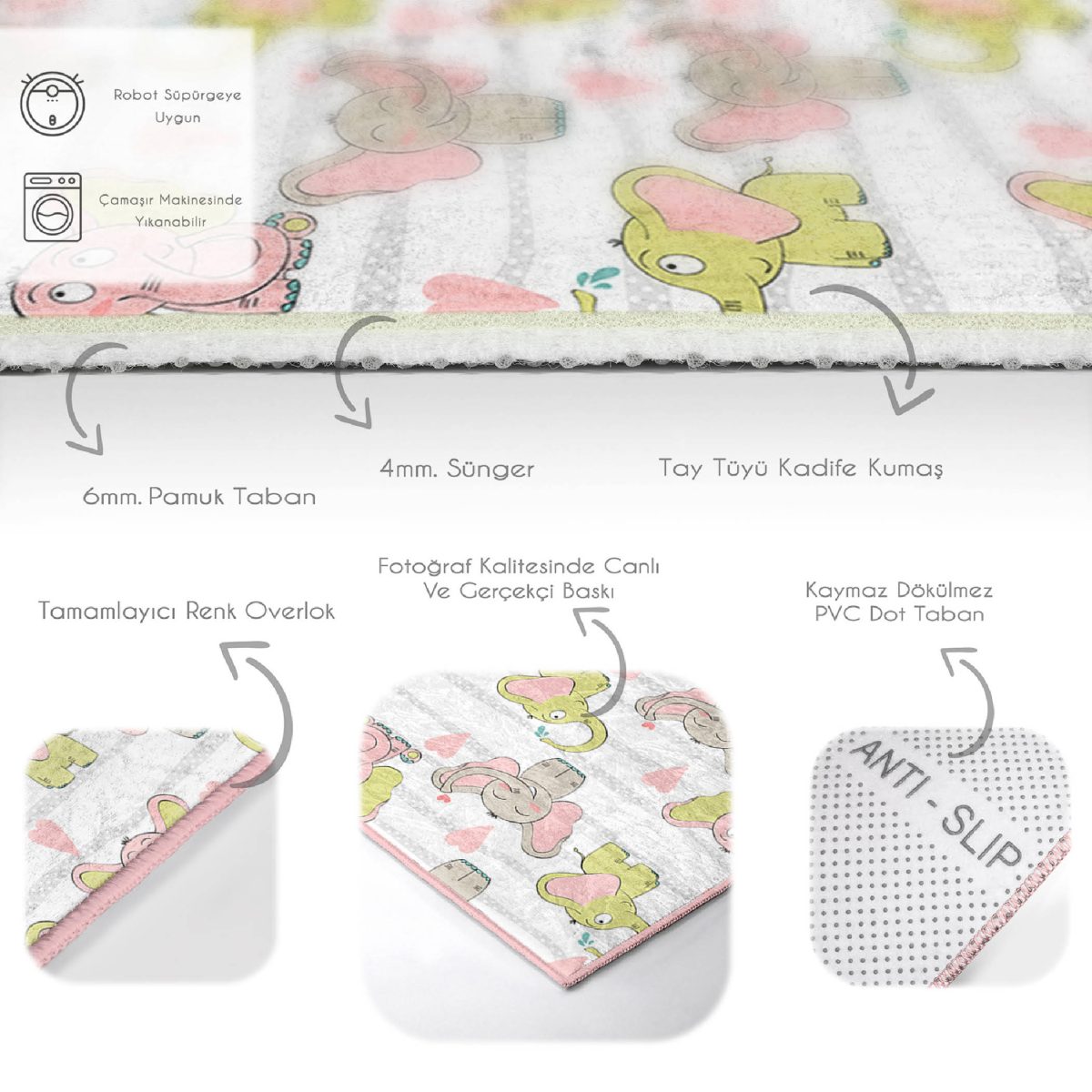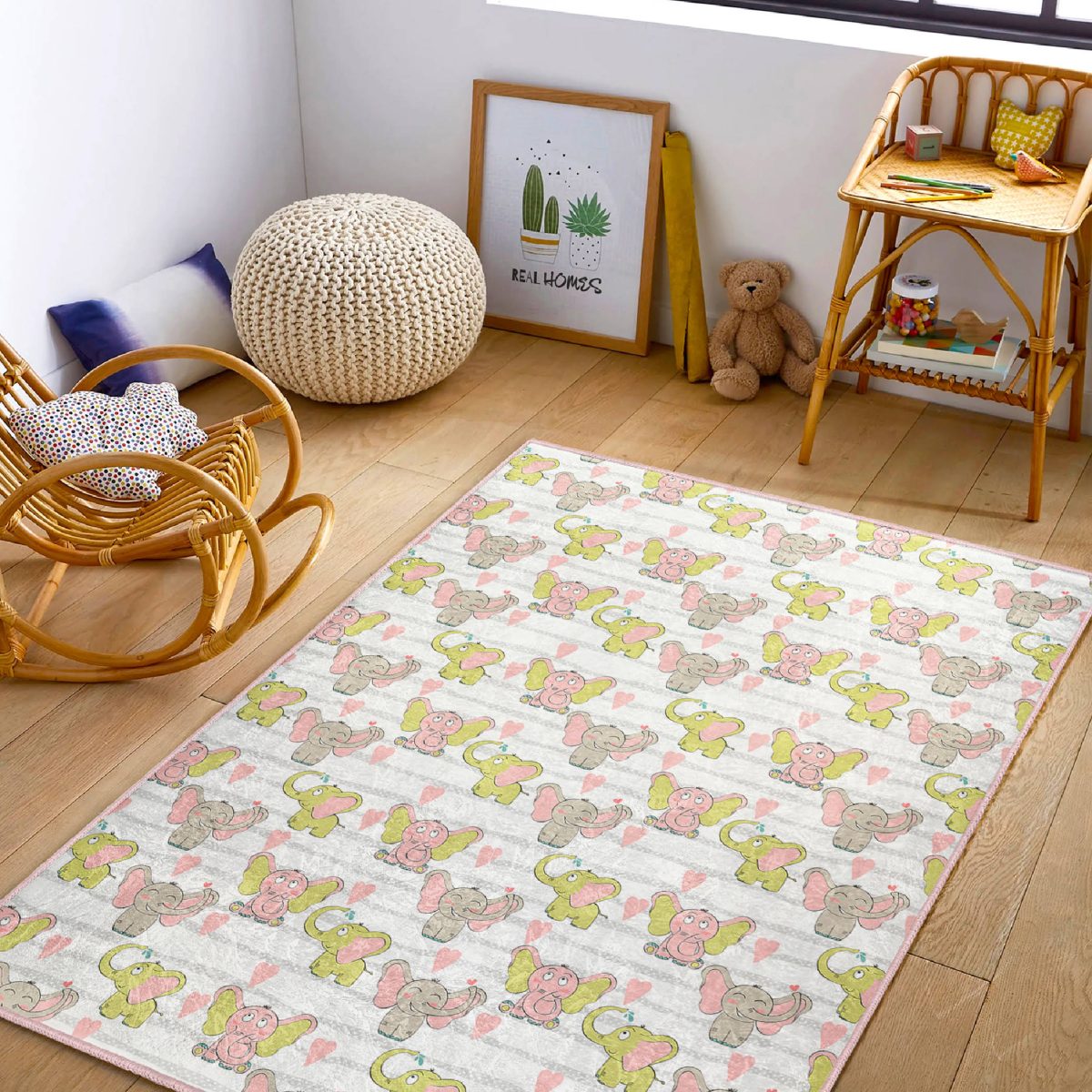 Sevimli Fil Motifli Çocuk & Genç Odası Makinede Yıkanabilir Kaymaz Tabanlı Kolay Temizlenebilir Leke Tutmaz Dikdörtgen Çocuk Halısı