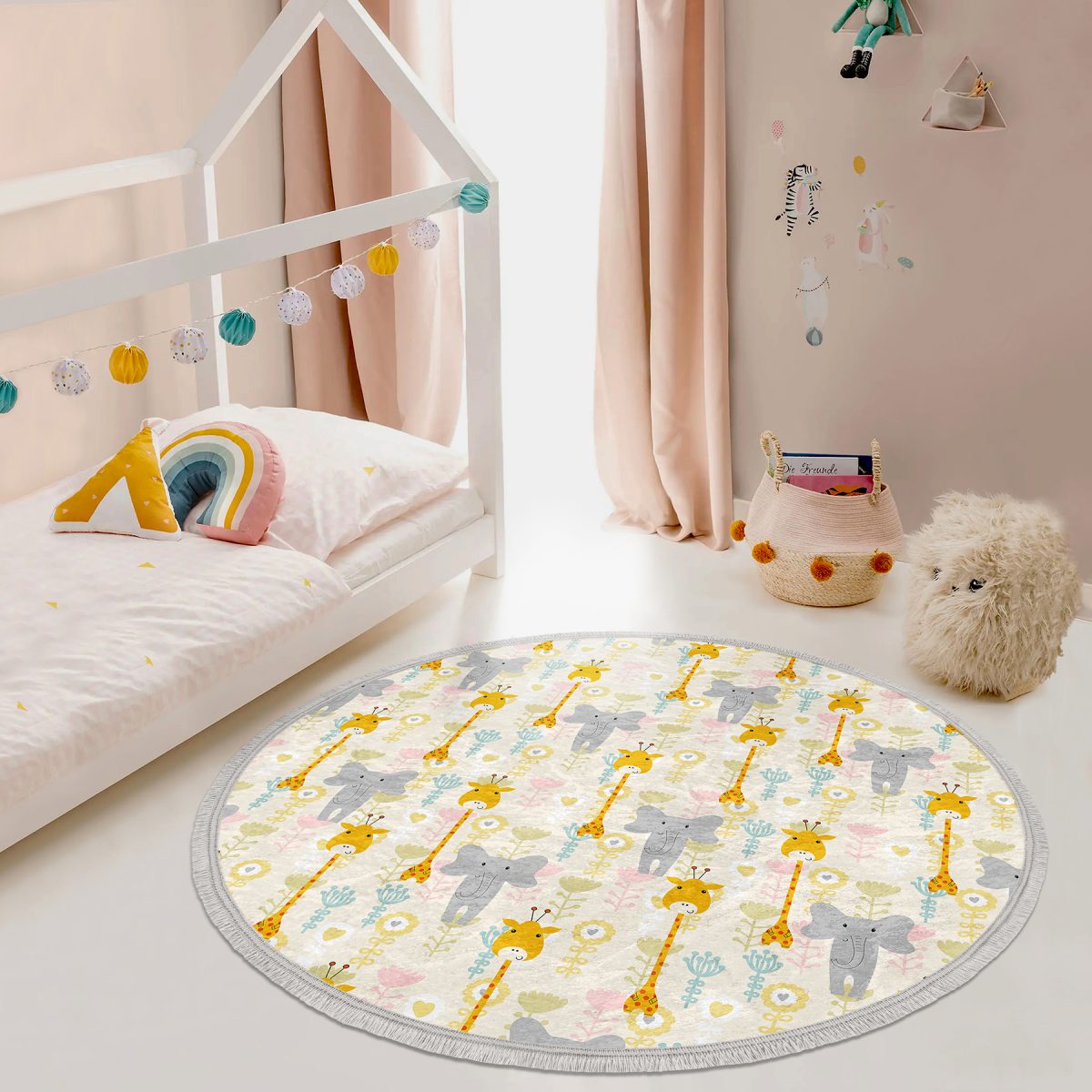 Sevimli Orman Hayvanları Desenli Çocuk & Genç Odası Makinede Yıkanabilir Kaymaz Tabanlı Püsküllü Yuvarlak Çocuk Halısı