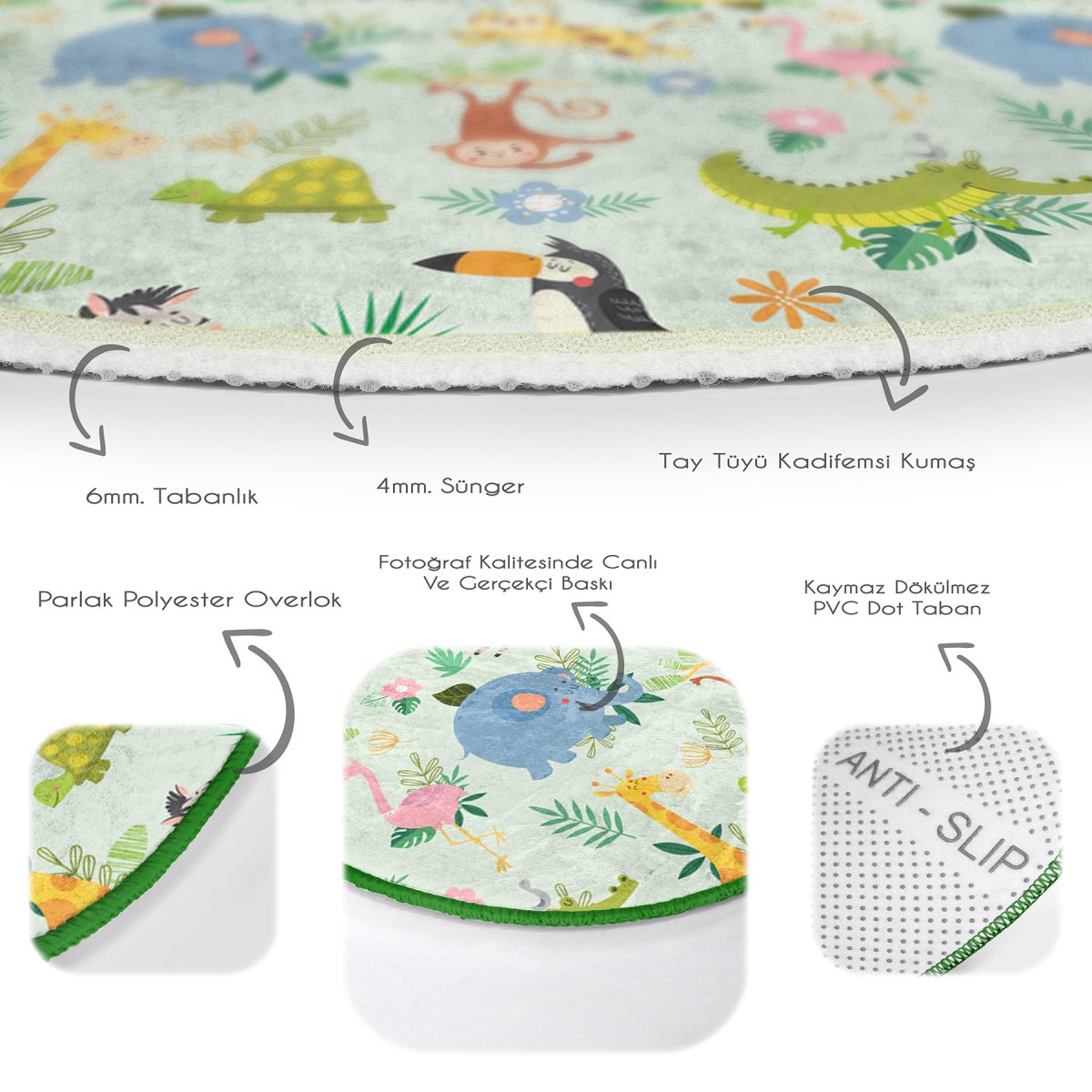 Sevimli Orman Hayvanları Desenli Çocuk & Genç Odası Makinede Yıkanabilir Kaymaz Tabanlı Yuvarlak Çocuk Halısı
