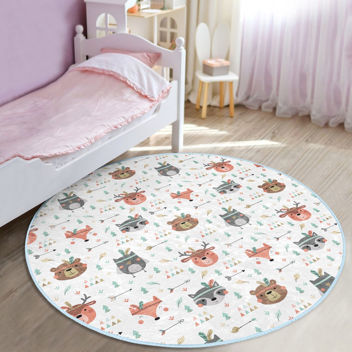 Sevimli Orman Hayvanları Motifli Çocuk & Genç Odası Makinede Yıkanabilir Kaymaz Tabanlı Yuvarlak Çocuk Halısı