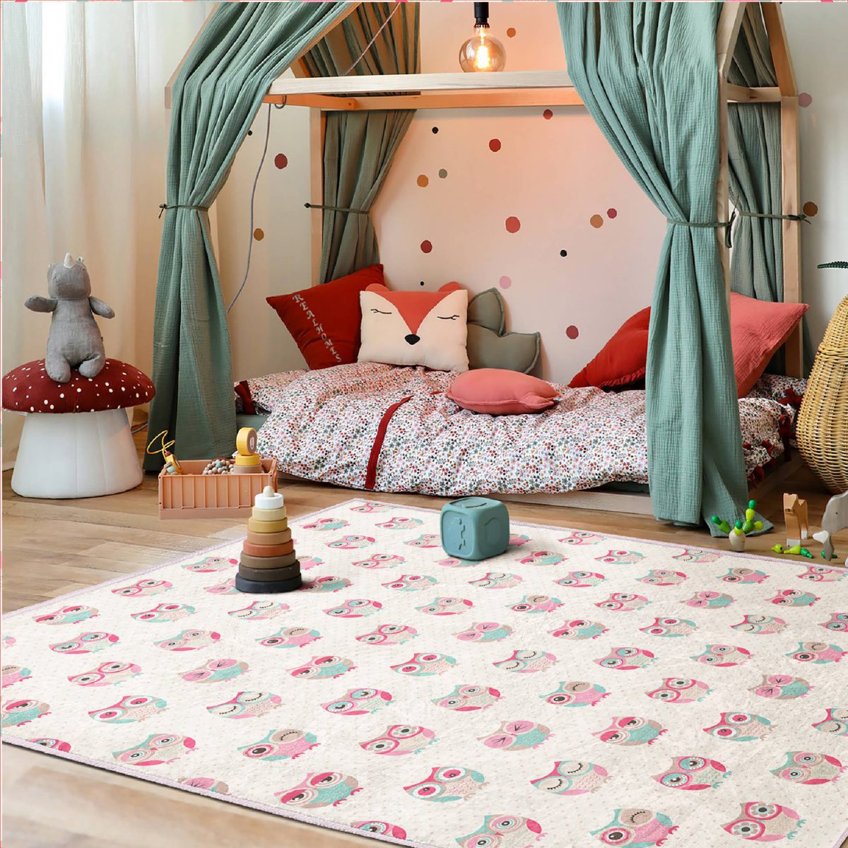 Sevimli Pembe Baykuşlar Temalı Çocuk & Genç Odası Makinede Yıkanabilir Kaymaz Tabanlı Kolay Temizlenebilir Leke Tutmaz Dikdörtgen Çocuk Halısı