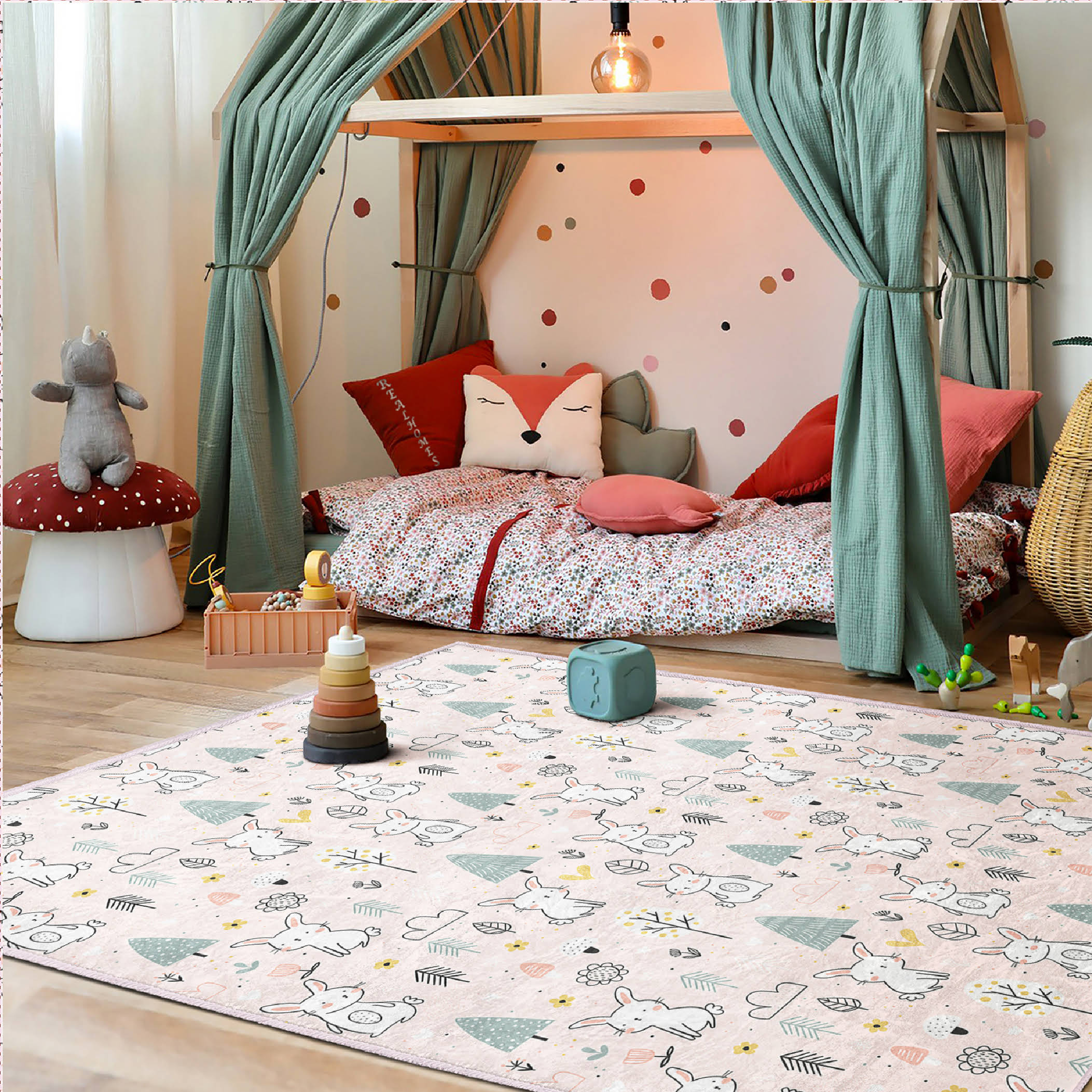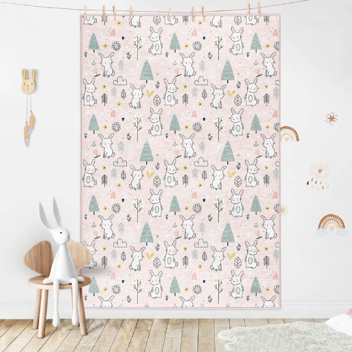 Sevimli Tavşan Çizimli Çocuk & Genç Odası Makinede Yıkanabilir Kaymaz Tabanlı Dikdörtgen Özel Ölçü Dekoratif Çocuk Halısı