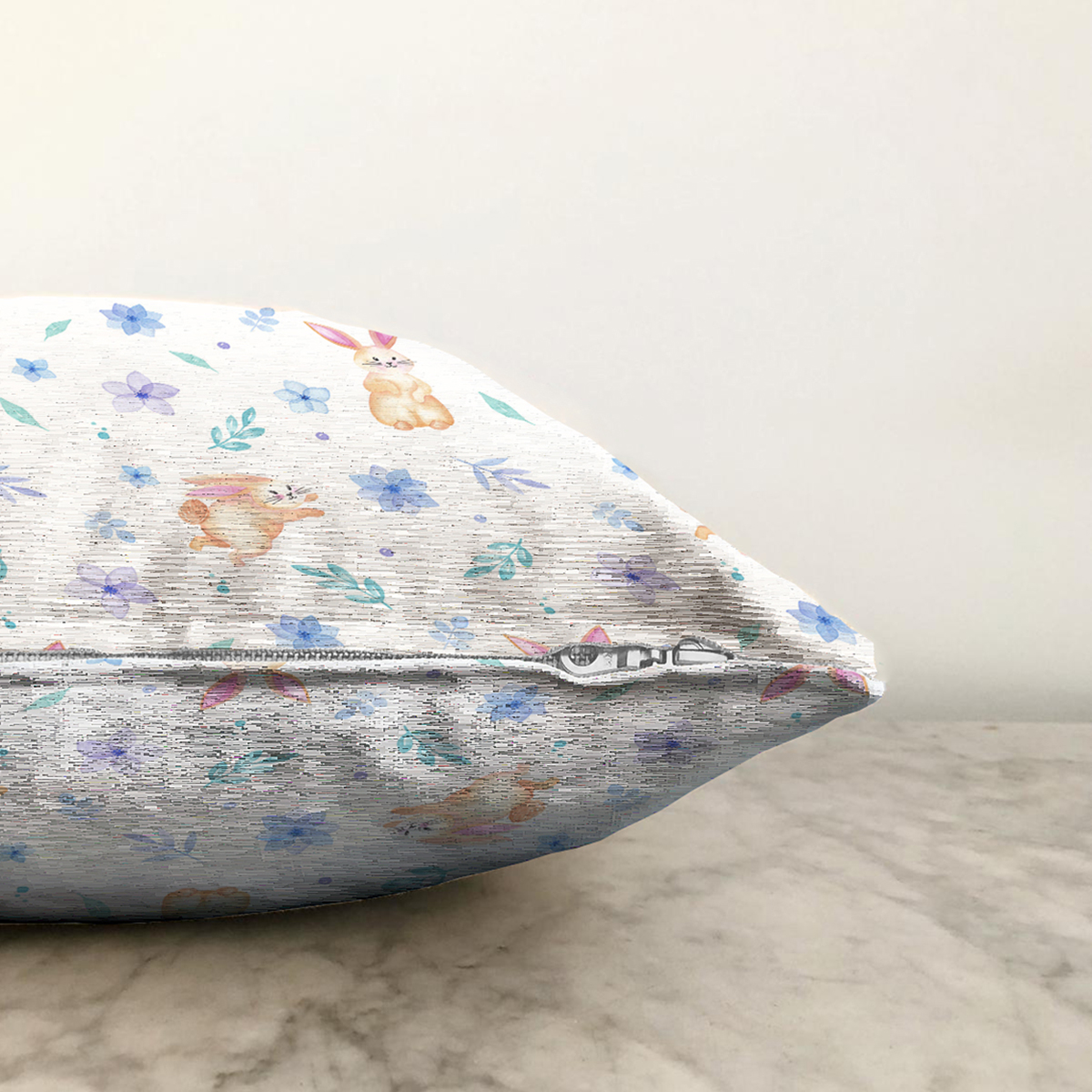 Sevimli Tavşan Ve Çiçek Motifli Dijital Baskılı Özel Tasarım Modern Şönil Yastık Kırlent Kılıfı
