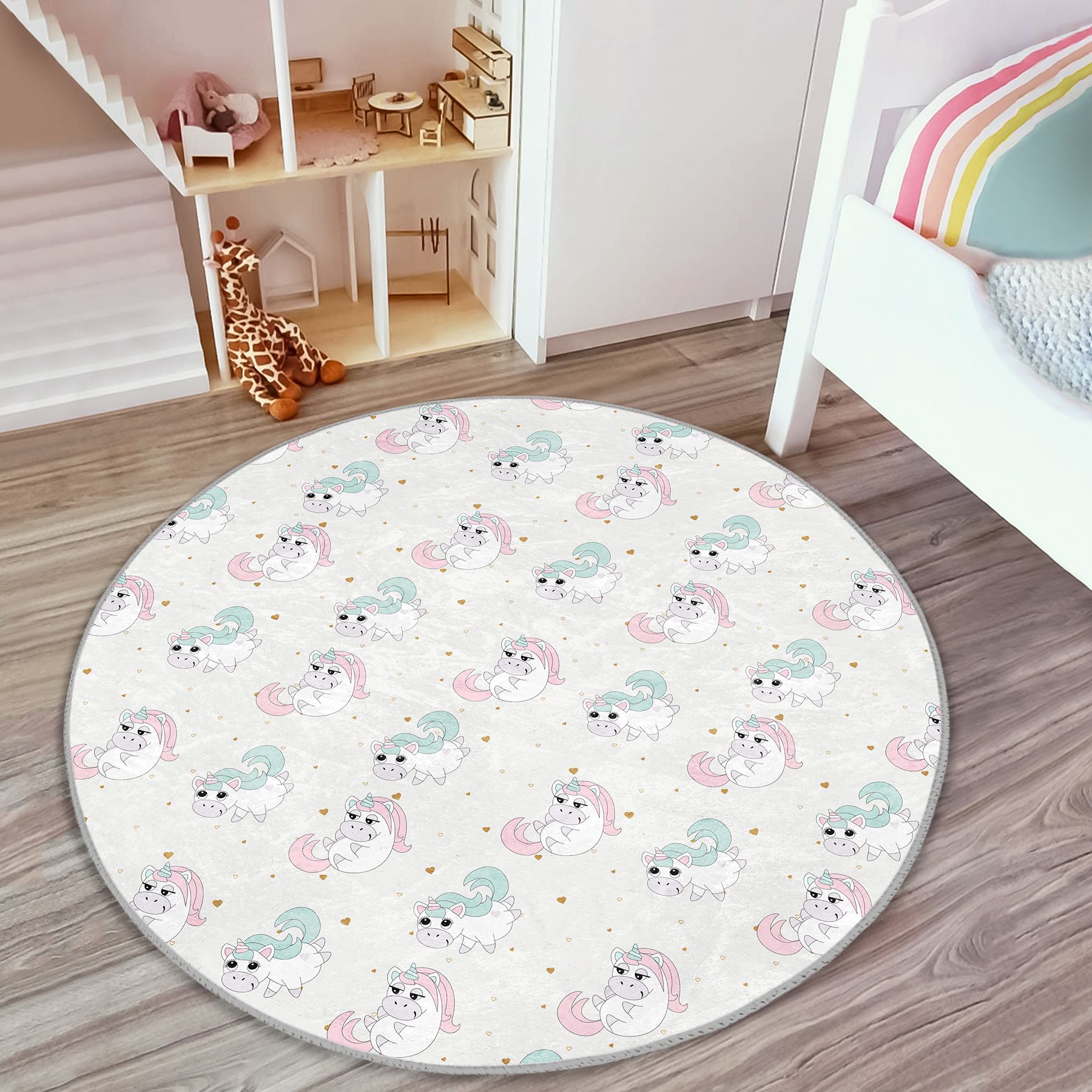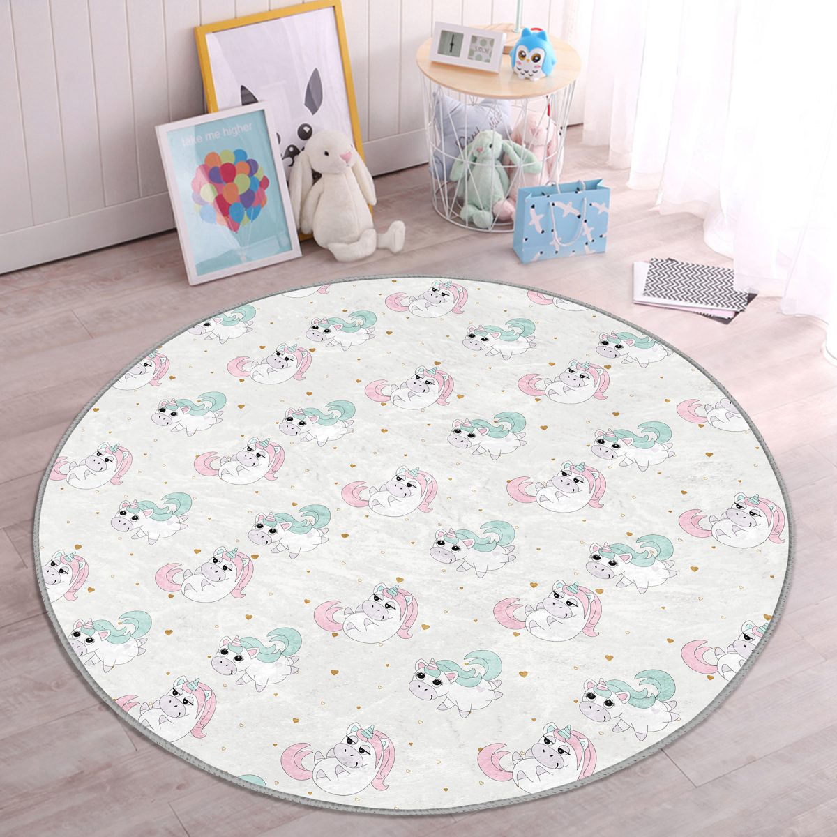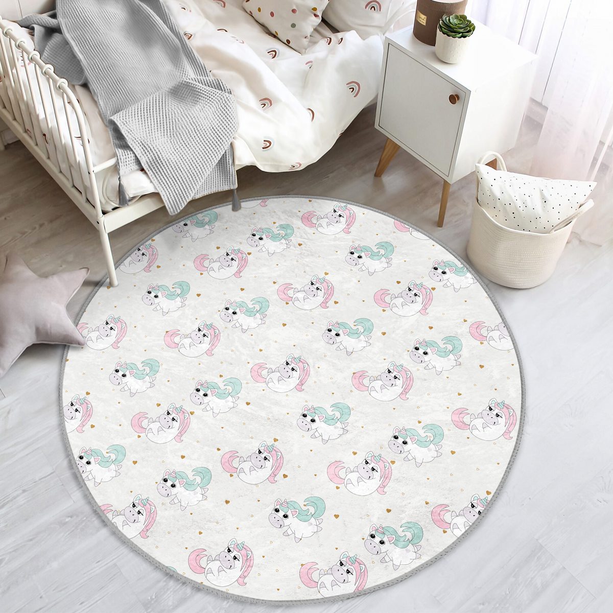 Sevimli Unicorn Desenli Çocuk & Genç Odası Makinede Yıkanabilir Kaymaz Tabanlı Yuvarlak Çocuk Halısı