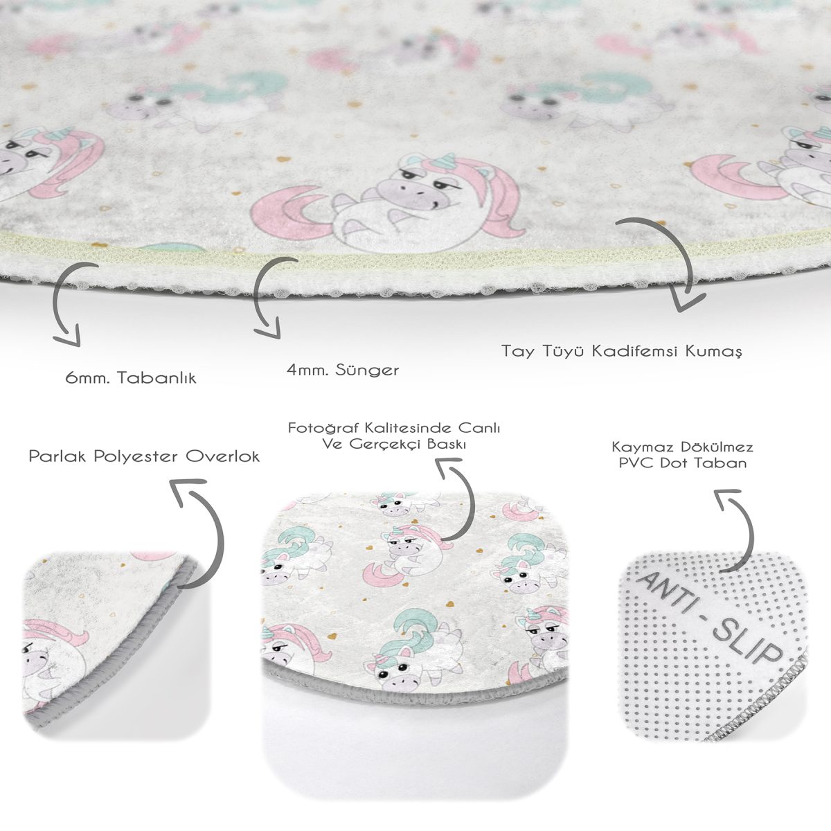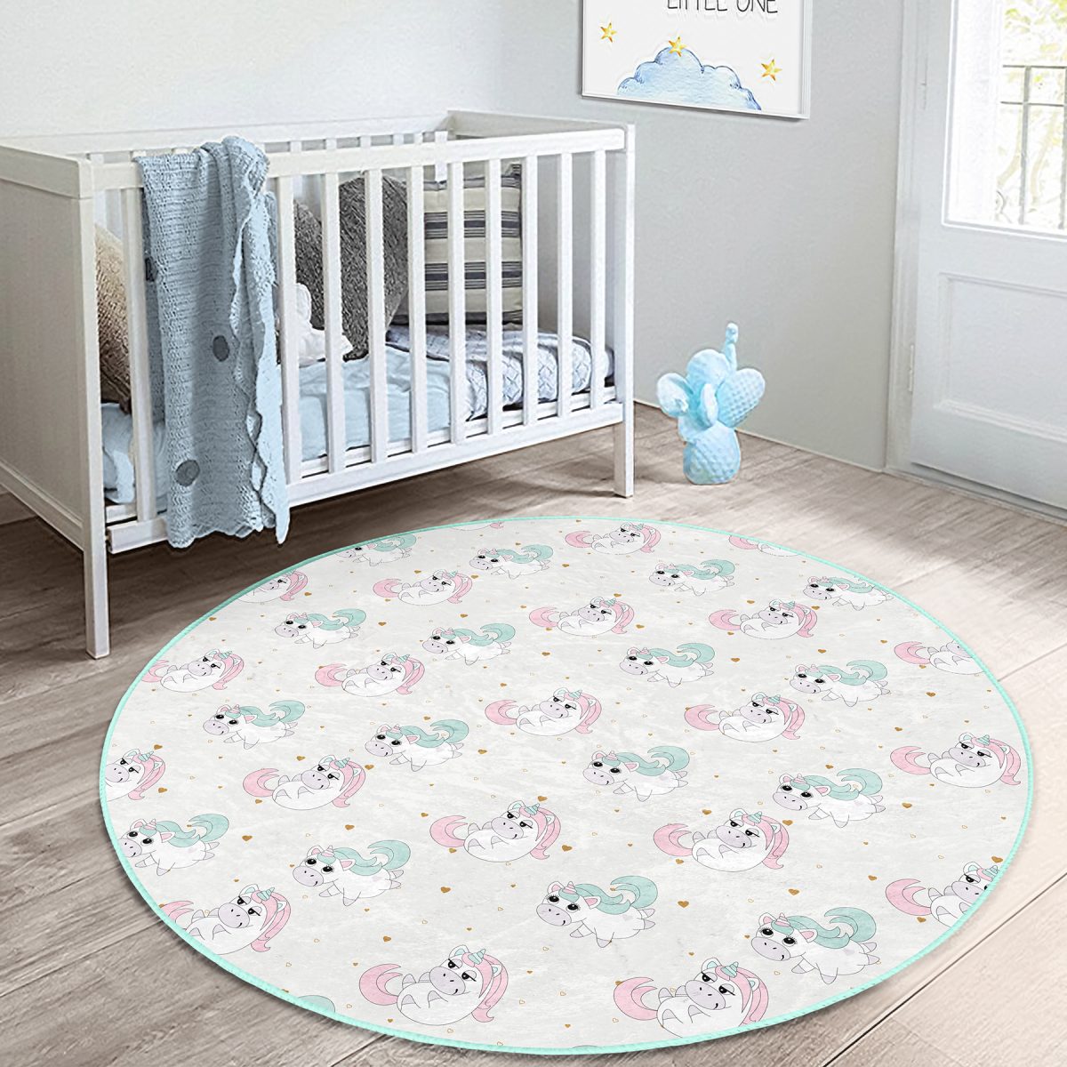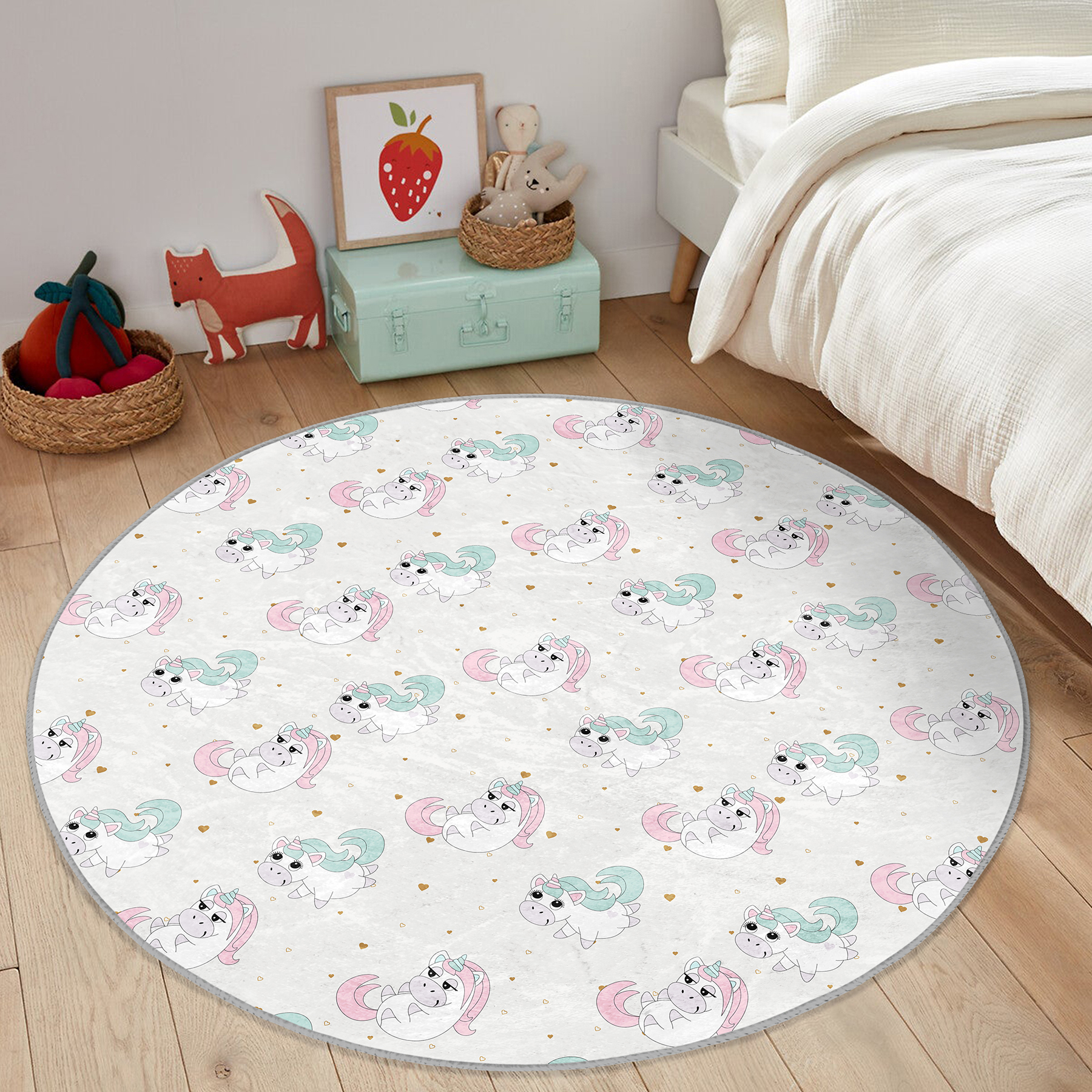 Sevimli Unicorn Desenli Çocuk & Genç Odası Makinede Yıkanabilir Kaymaz Tabanlı Yuvarlak Çocuk Halısı