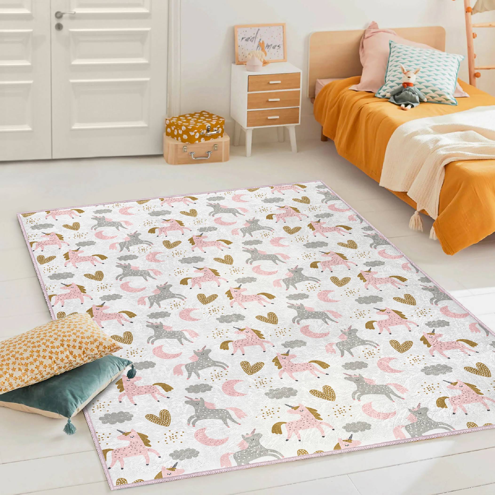 Sevimli Unicorn Temalı Çocuk & Genç Odası Makinede Yıkanabilir Kaymaz Tabanlı Pamuk Tabanlı Dikdörtgen Özel Ölçü Çocuk Halısı