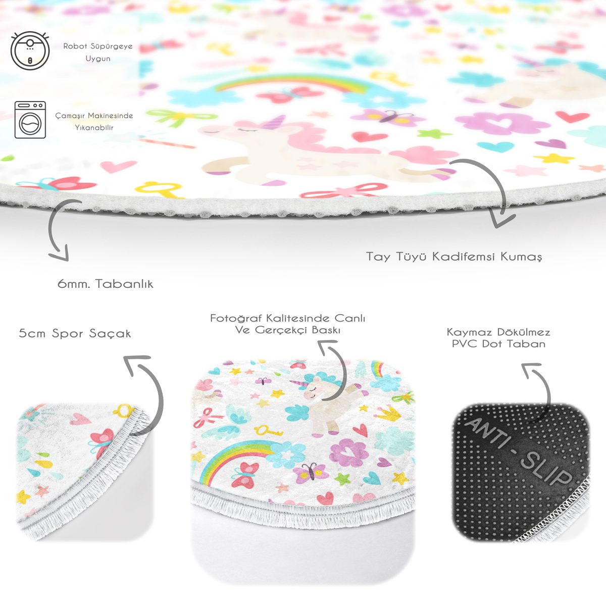 Sevimli Unicorn Ve Gökkuşağı Desenli Çocuk & Genç Odası Makinede Yıkanabilir Kaymaz Tabanlı Püsküllü Yuvarlak Çocuk Halısı