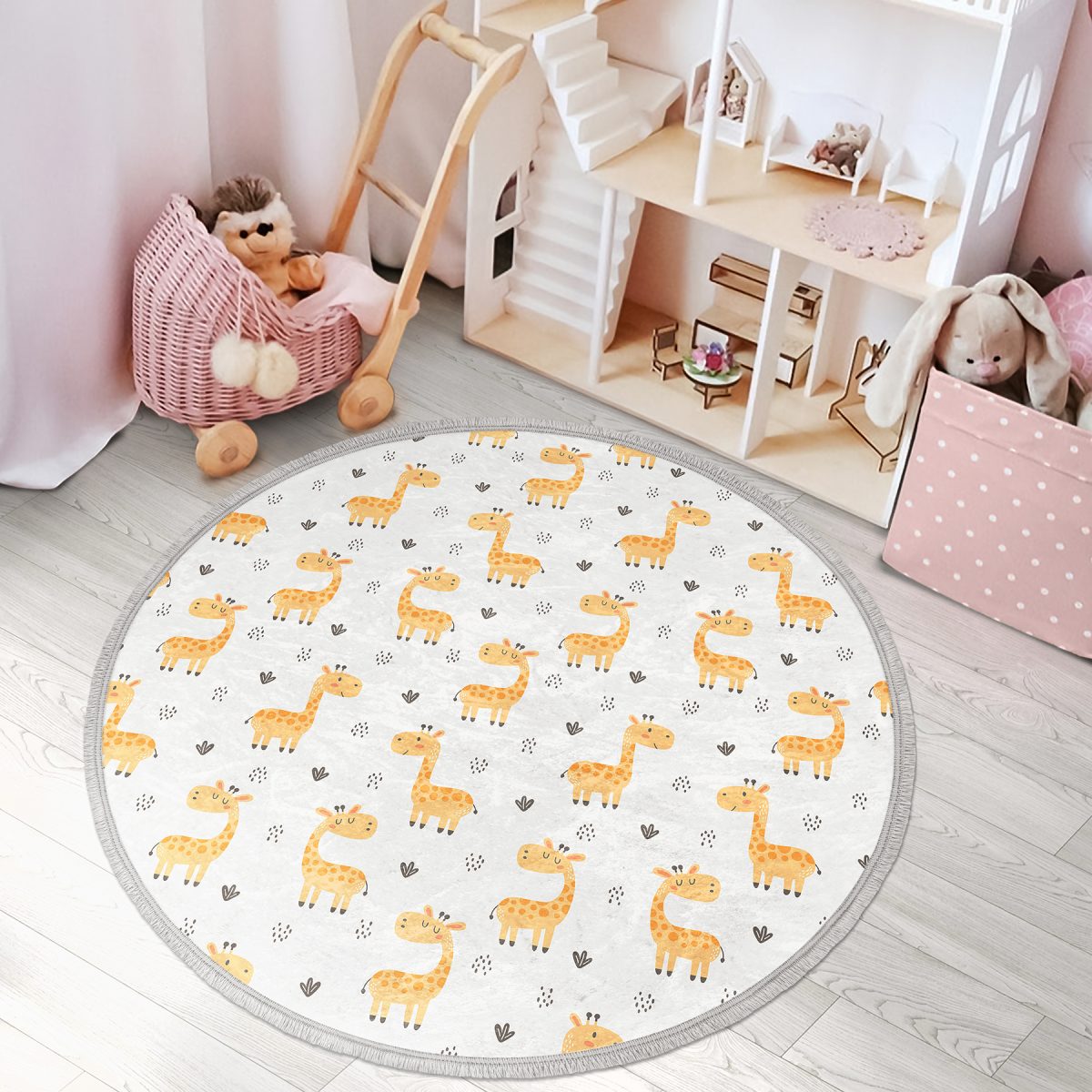 Sevimli Zürafa Tasarımlı Çocuk & Genç Odası Makinede Yıkanabilir Kaymaz Tabanlı Püsküllü Yuvarlak Çocuk Halısı