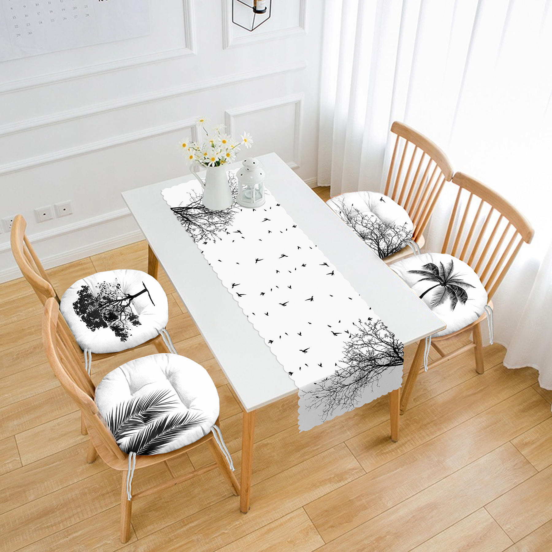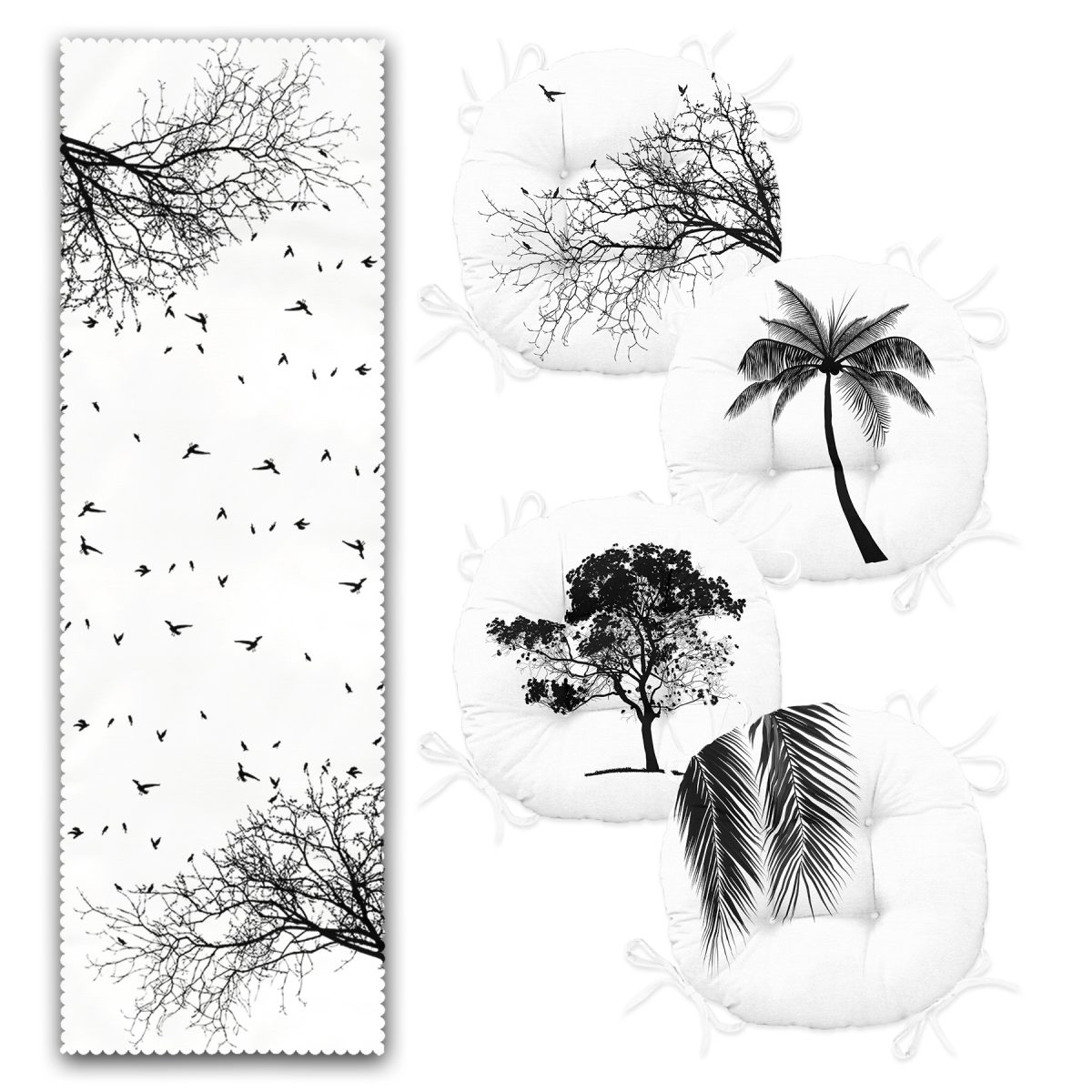 Siyah Beyaz Ağaç Tasarımlı Dijital Baskılı 4 Yuvarlak Pofuduk Sandalye Minderi ve 1 Runner Seti