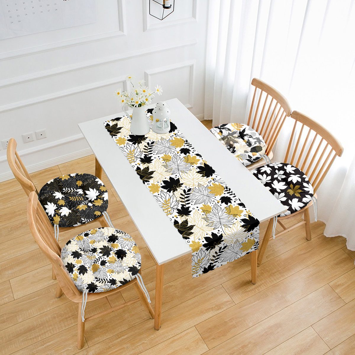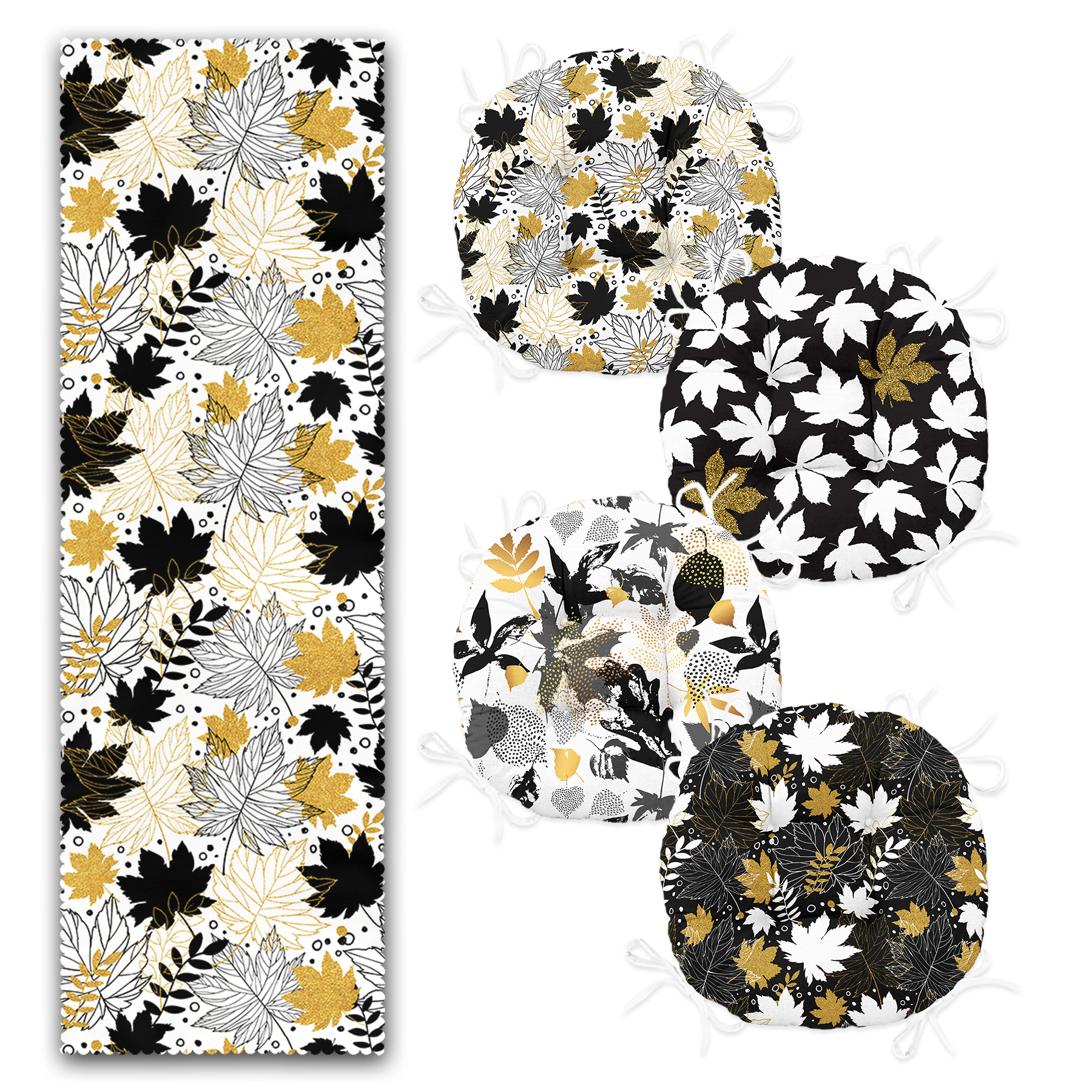 Siyah Beyaz Altın Varaklı Tropik Yaprak Motifli 4 Yuvarlak Pofuduk Sandalye Minderi ve 1 Runner Seti