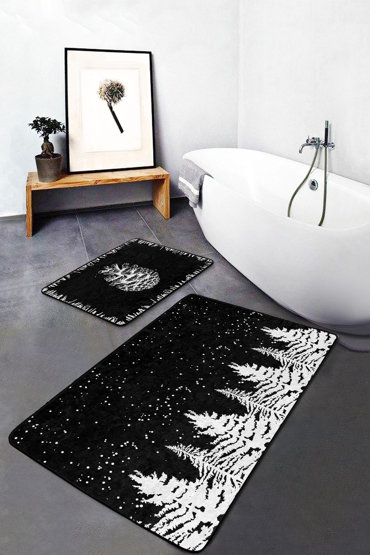 Siyah Beyaz Çam Ağacı Kozalak Tasarımlı 2’li Kaymaz Tabanlı Banyo & Mutfak Paspas Takımı