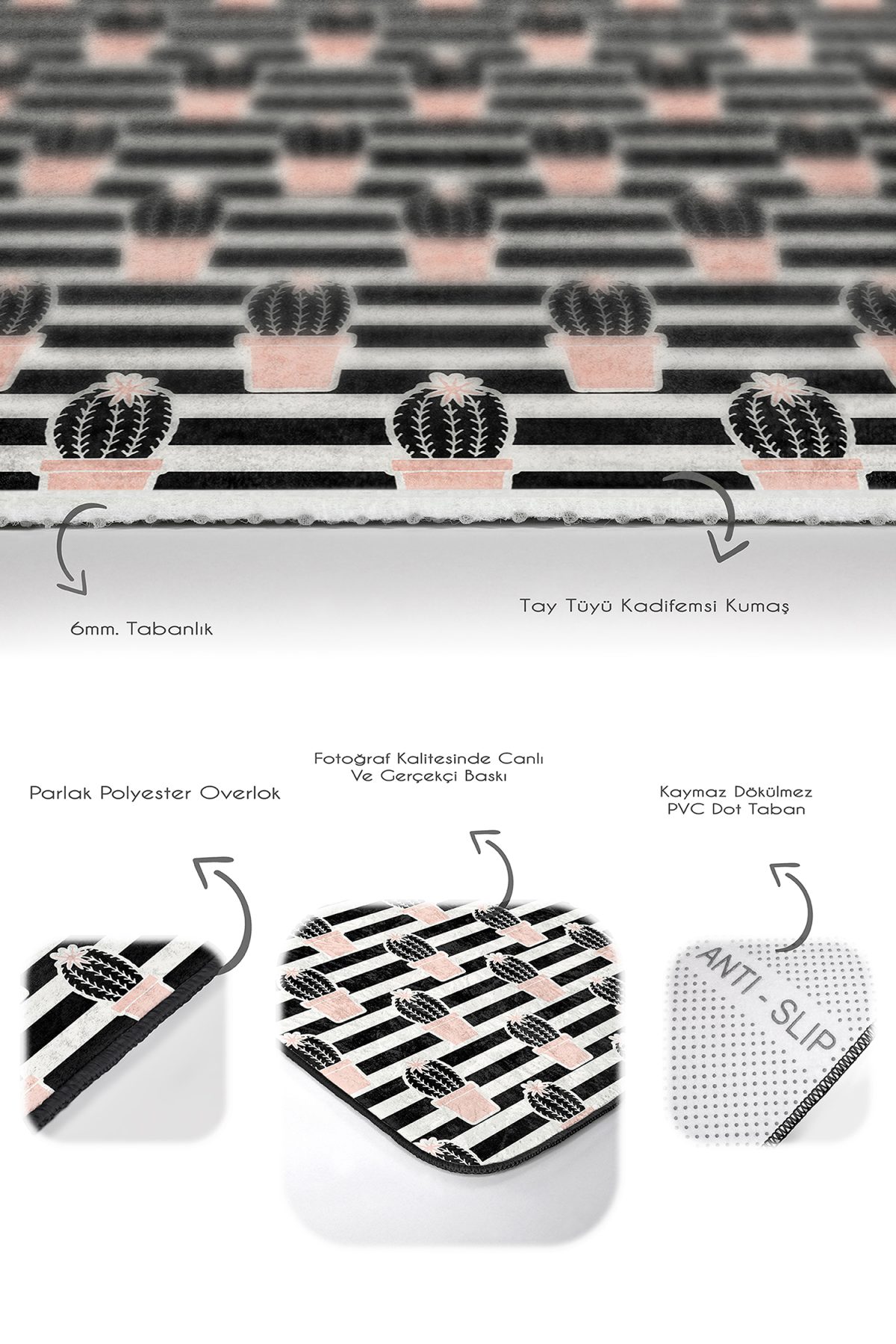 Siyah Beyaz Çizgili Kaktüs Motifli 2'li Kaymaz Tabanlı Banyo & Mutfak Paspas Takımı Realhomes