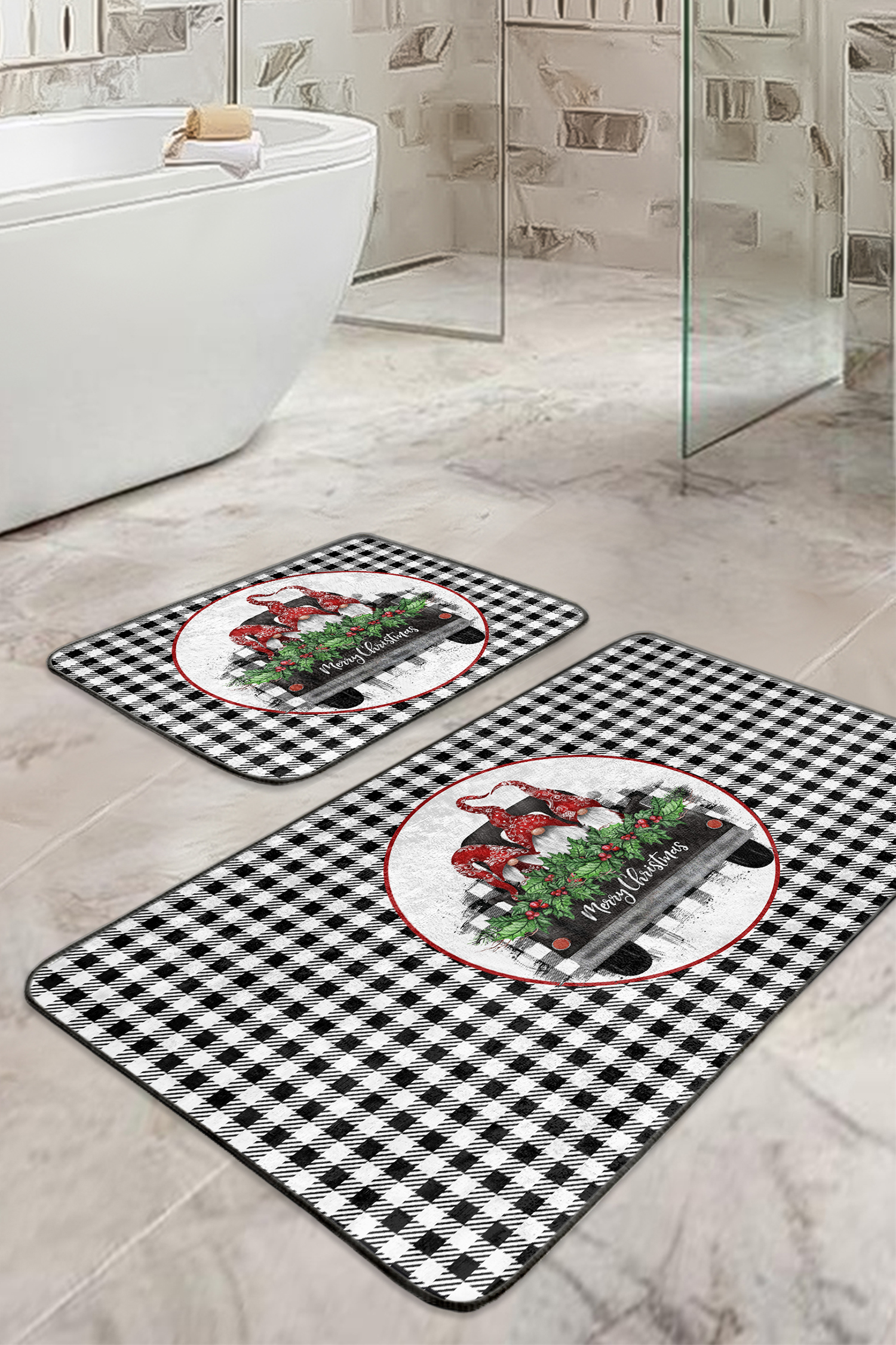 Siyah Beyaz Ekose Tasarımlı 2’li Banyo Paspas Takımı & Mutfak Paspas Seti