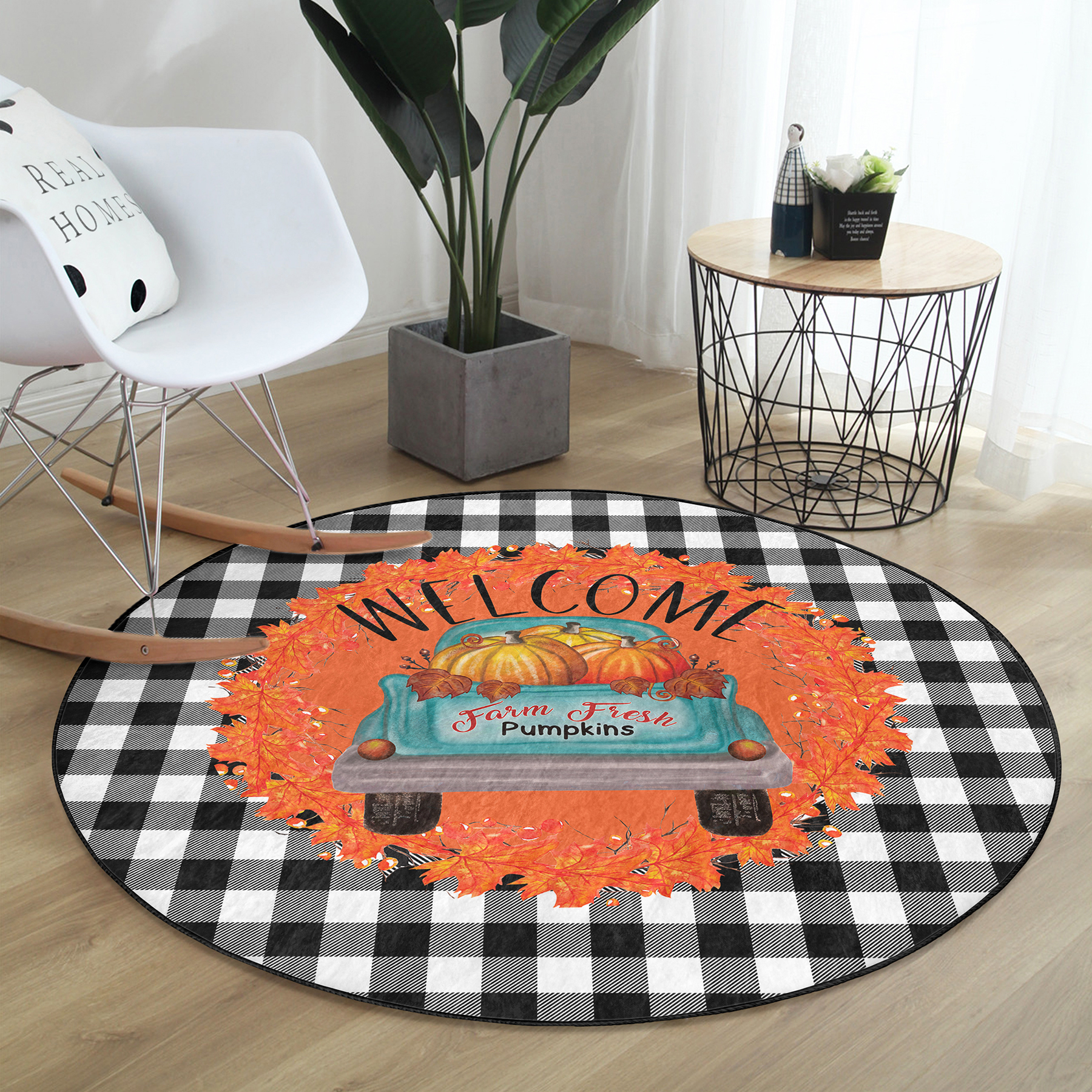 Siyah Beyaz Ekose Tasarımlı Sonbahar Welcome Temalı Turuncu Outdoor Yıkanabilir Kaymaz Tabanlı Yuvarlak Halı