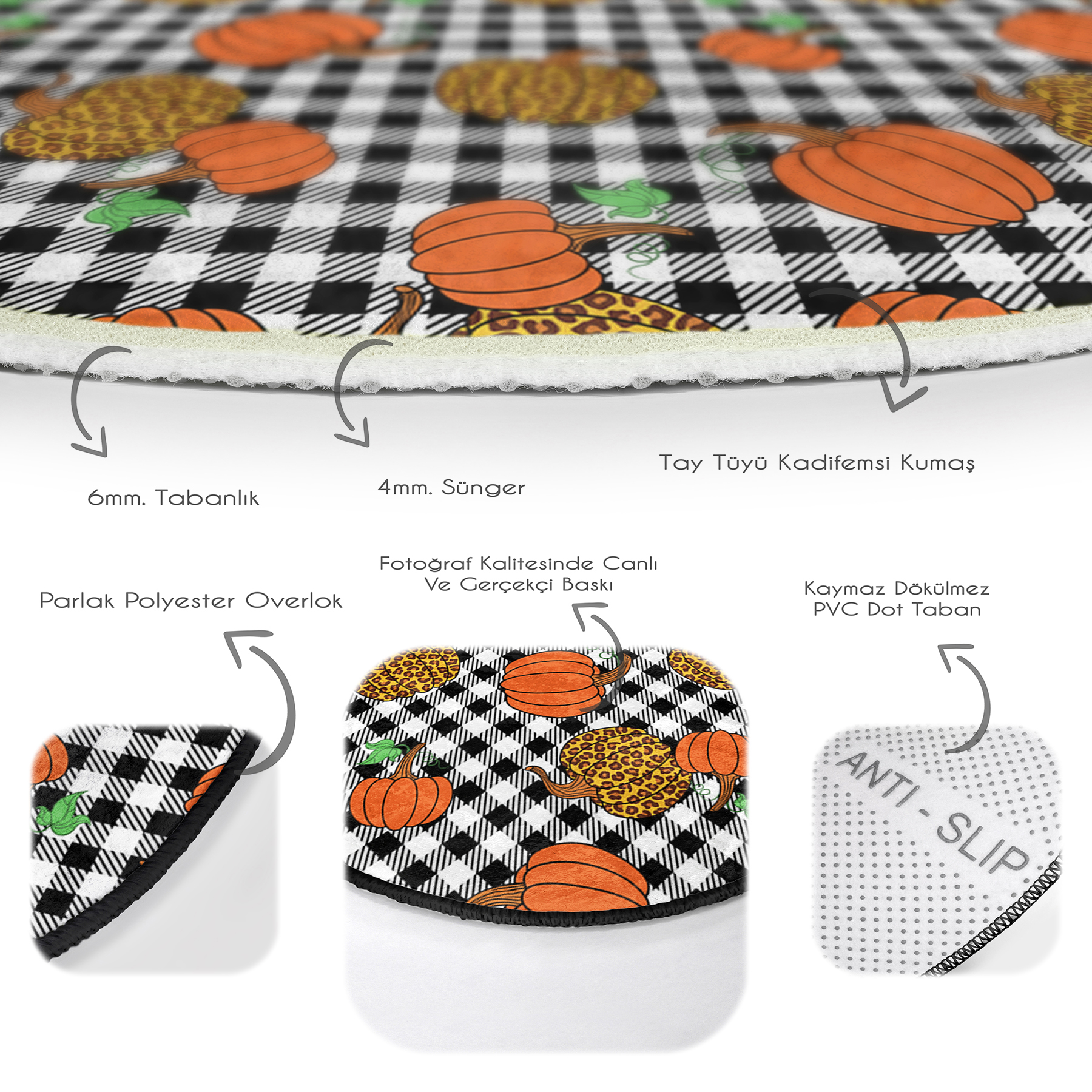 Siyah Beyaz Ekose Üzerinde Renkli Balkabağı Desenli Dijital Baskılı Modern Turuncu Balkon Yıkanabilir Kaymaz Tabanlı Yuvarlak Halı