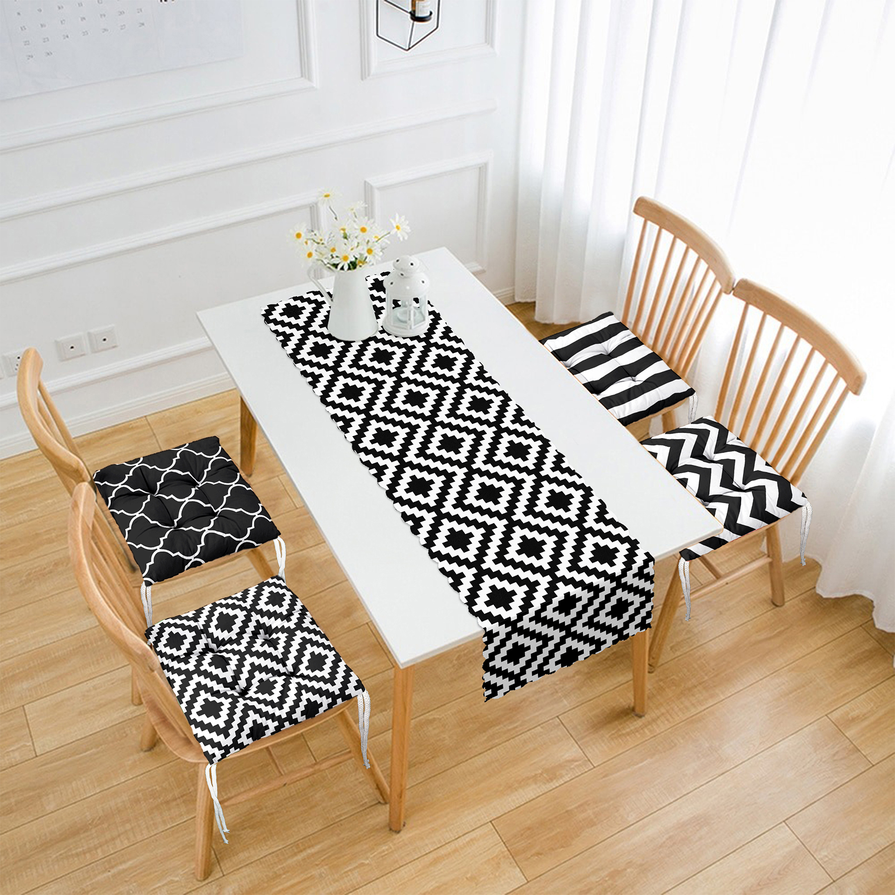 Siyah Beyaz Geometrik Çizimler Tasarımlı 4 Pofuduk Sandalye Minderi ve 1 Runner Seti Realhomes