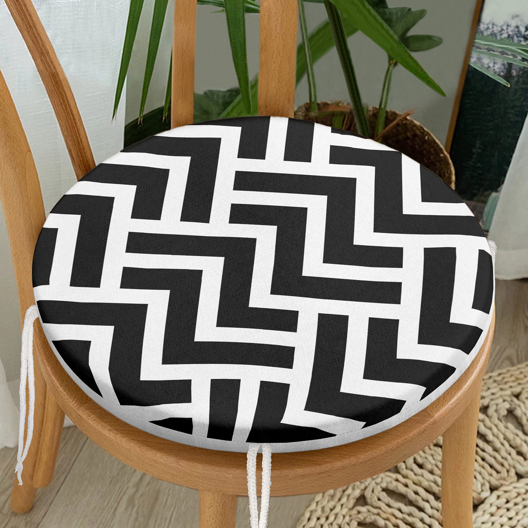 Siyah Beyaz Geometrik Desenli Yuvarlak Fermuarlı Sandalye Minderi