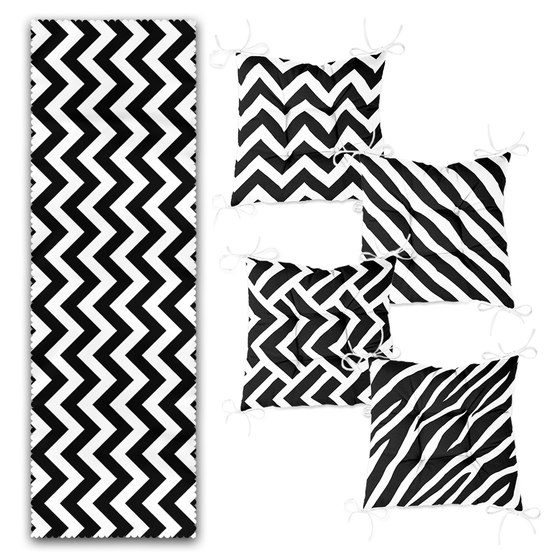 Siyah Beyaz Geometrik Tasarımlı 4 Pofuduk Sandalye Minderi ve 1 Runner Seti