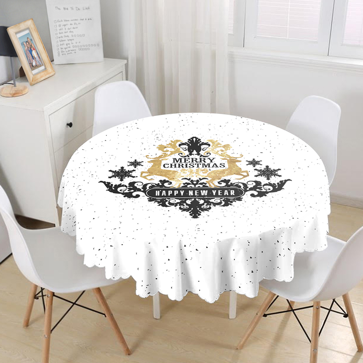 Siyah Beyaz Geyikli Mery Christmas Motifli Dijital Baskılı Modern Yuvarlak Masa Örtüsü – Çap 140cm