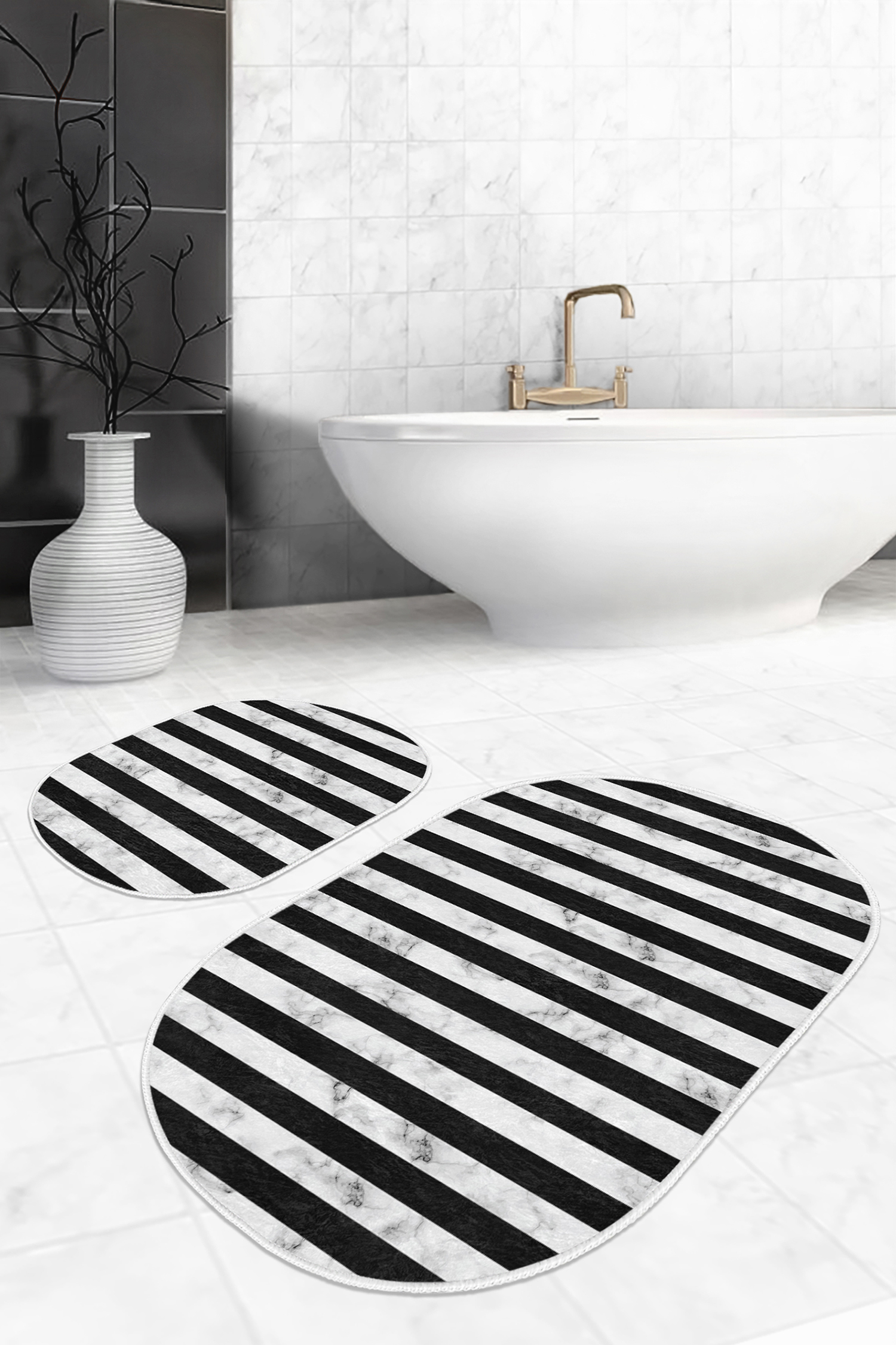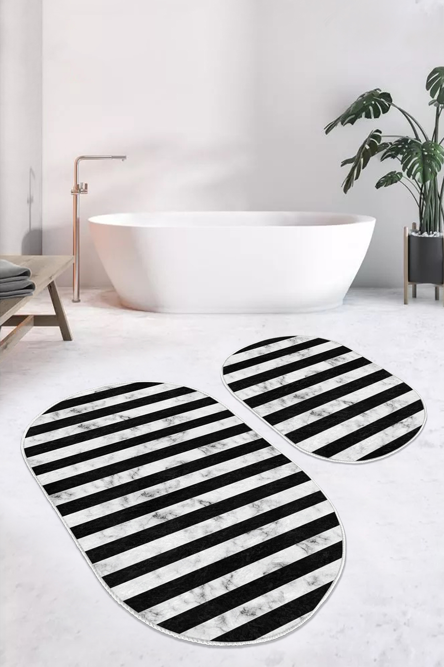 Siyah Beyaz Mermer Motifli Dijital Baskılı 2’li Oval Kaymaz Tabanlı Banyo & Mutfak Paspas Takımı