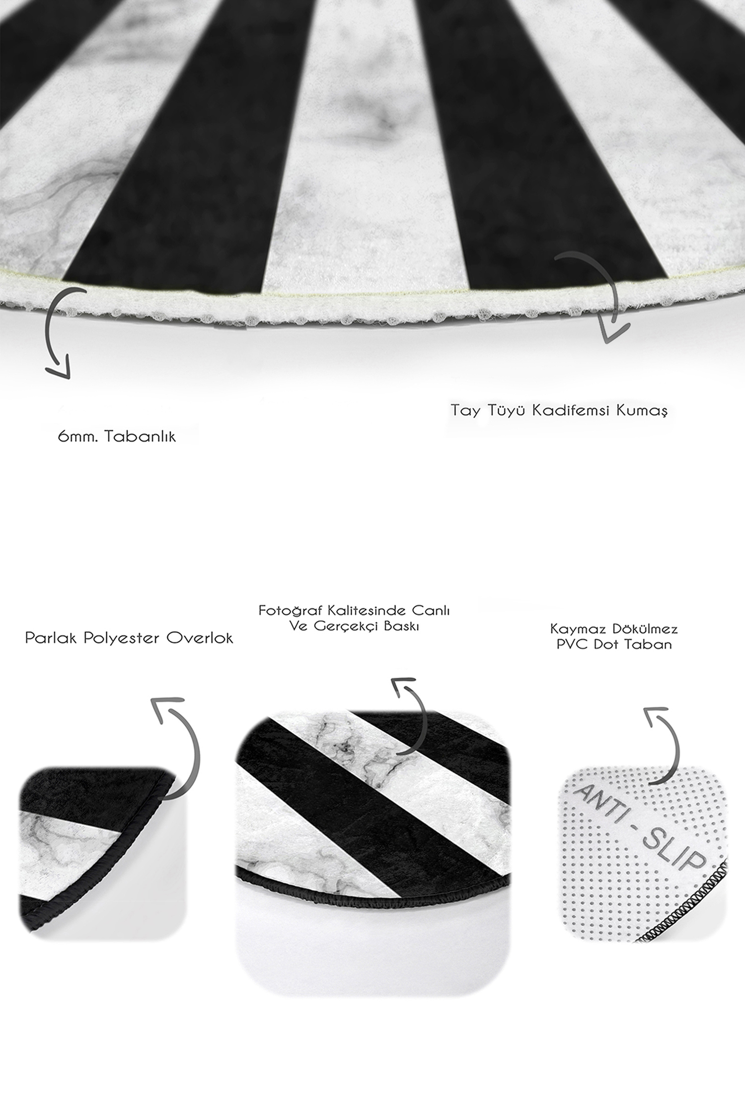 Siyah Beyaz Mermer Motifli Dijital Baskılı 2'li Oval Kaymaz Tabanlı Banyo & Mutfak Paspas Takımı Realhomes
