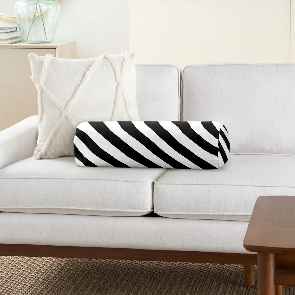 Siyah Beyaz Şeritli Dijital Baskılı İç Dolgulu Yumuşak Silindir Form Yastık Kırlent