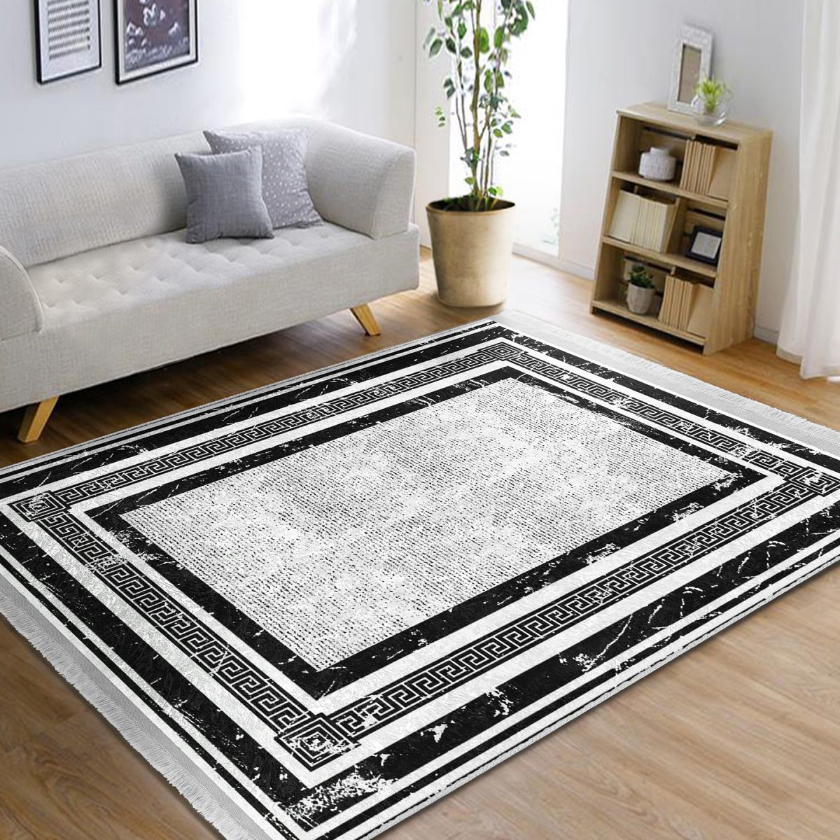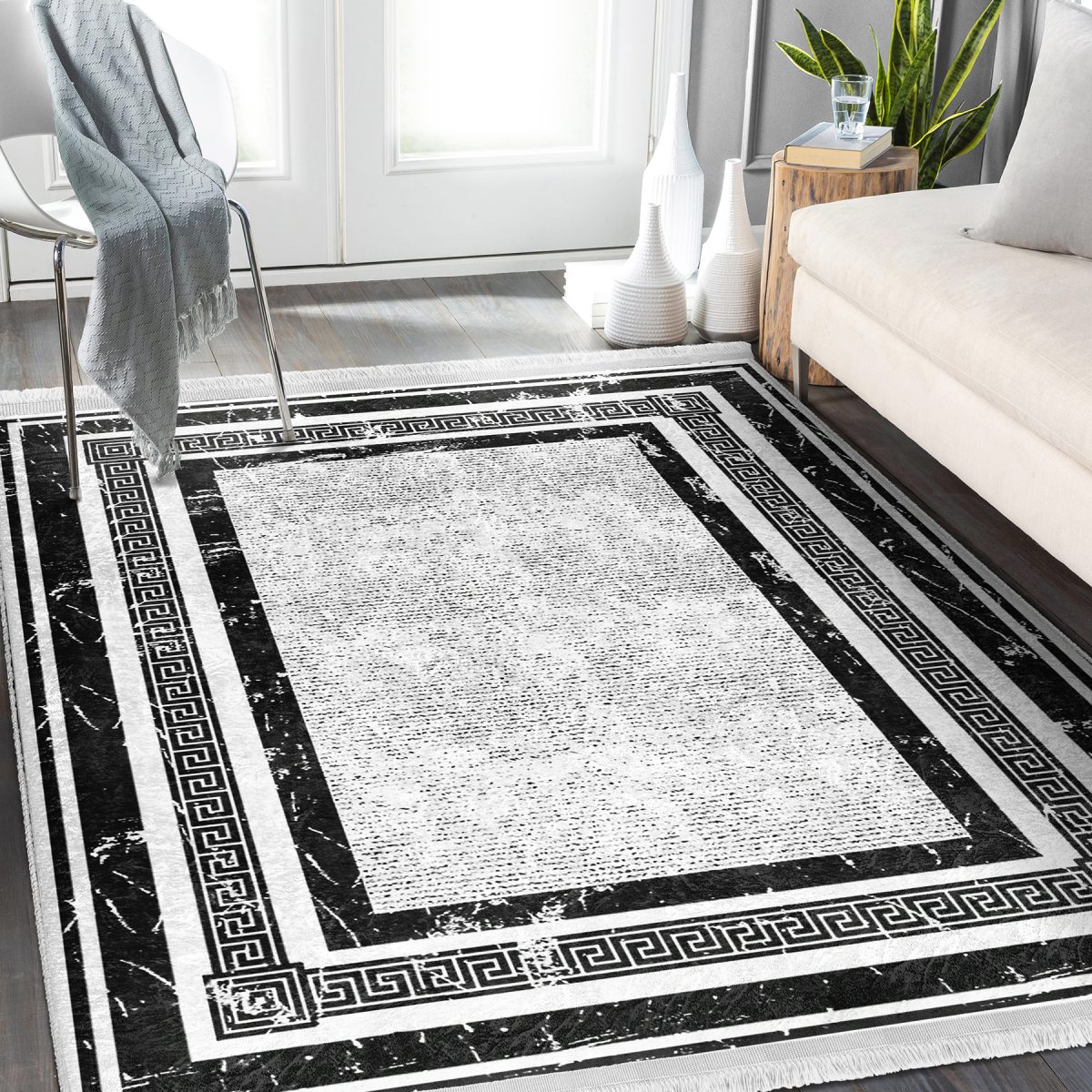 Siyah – Beyaz Zeminde Çerçeveli Motifli Klasik Desenli Geometrik Sade & Şık Salon & Oturma Odası Yatak Odası Dijital Baskılı Makinede Yıkanabilir Kaymaz Taban Saçaklı Halı